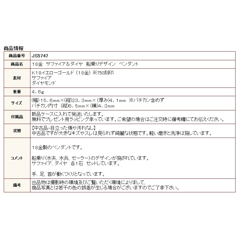 | 商品名 | 18金 サファイア&ダイヤ 船乗りデザイン ペンダント |