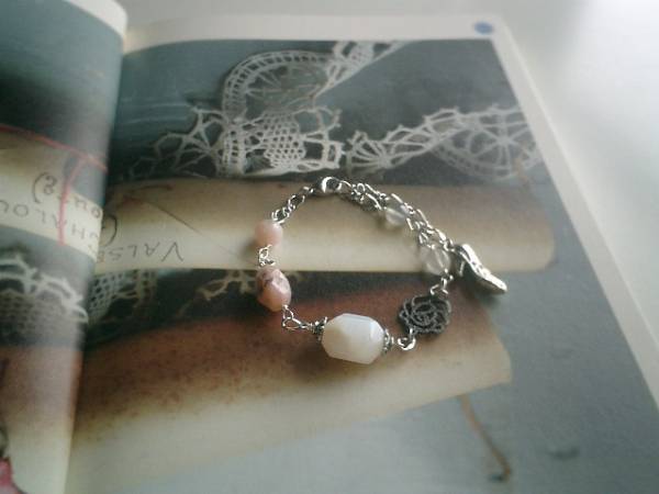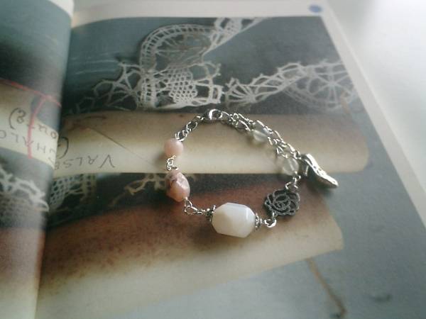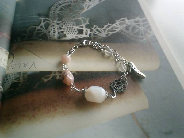 大人色の物語・・シリーズです♪やさしいピンクオパールと薔薇のブレスレットです♪8ミリの丸玉のピンクオパールに8ミリ位のオーバルのグレーカルセドニーやラフカットのピンクボツワナアゲートやホワイトオパールや薔薇のチャームを合わせて大人のロマンチックしています♪長さは全長23センチ位で調節自由です♪♪お揃いのネックレスも出品しています♪シンプルで飽きのこないいつまでも着けられるデザインを考えて作りました!ハンドメイドをご理解頂いてノークレーム、ノーリターンでお願いします