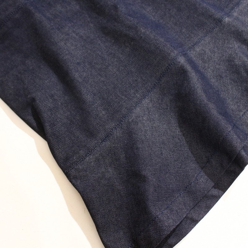 ストレッチが効いたデニム素材のスカート、若干の艶があり落ち着いたネイビーが綺麗です。ファスナーは左側です。