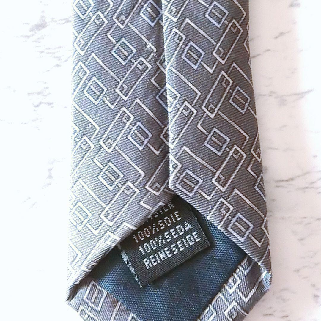 落ち着気のあるグレーにさり気ない幾何学模様のシルクネクタイです。