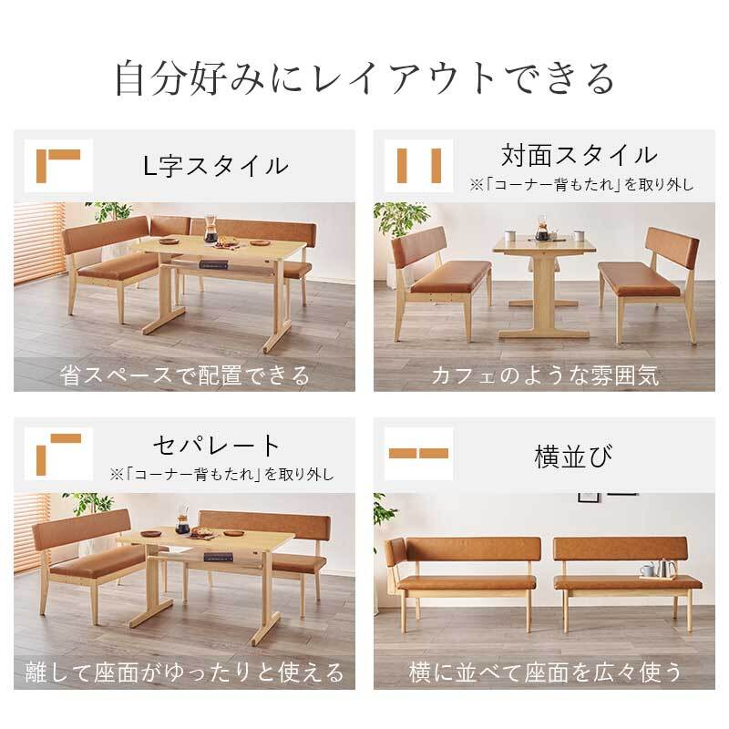 お部屋に合わせてレイアウトの変更ができ、天然木のシルエットと高級感のあるベンチシートがリビングダイニングのくつろぎ空間を演出。