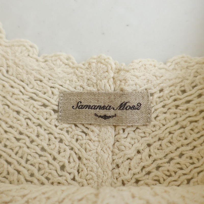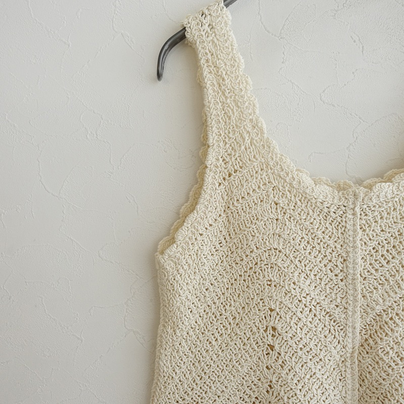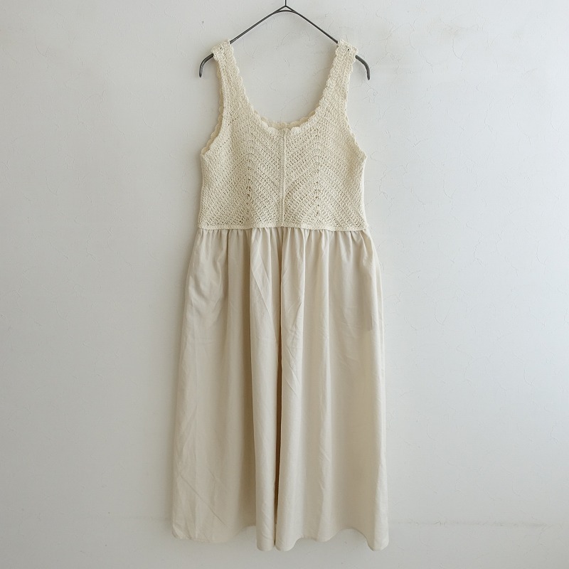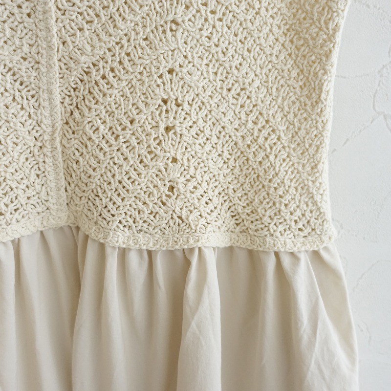 | Samansa Mos2 のクロシェ編み風切り替えノースリーブワンピースです。カラーはアイボリーで、上部は編地で仕立てられ、スカート部は透け感のある薄手のさらっとした生地に切り替えられています。 |