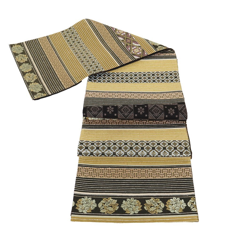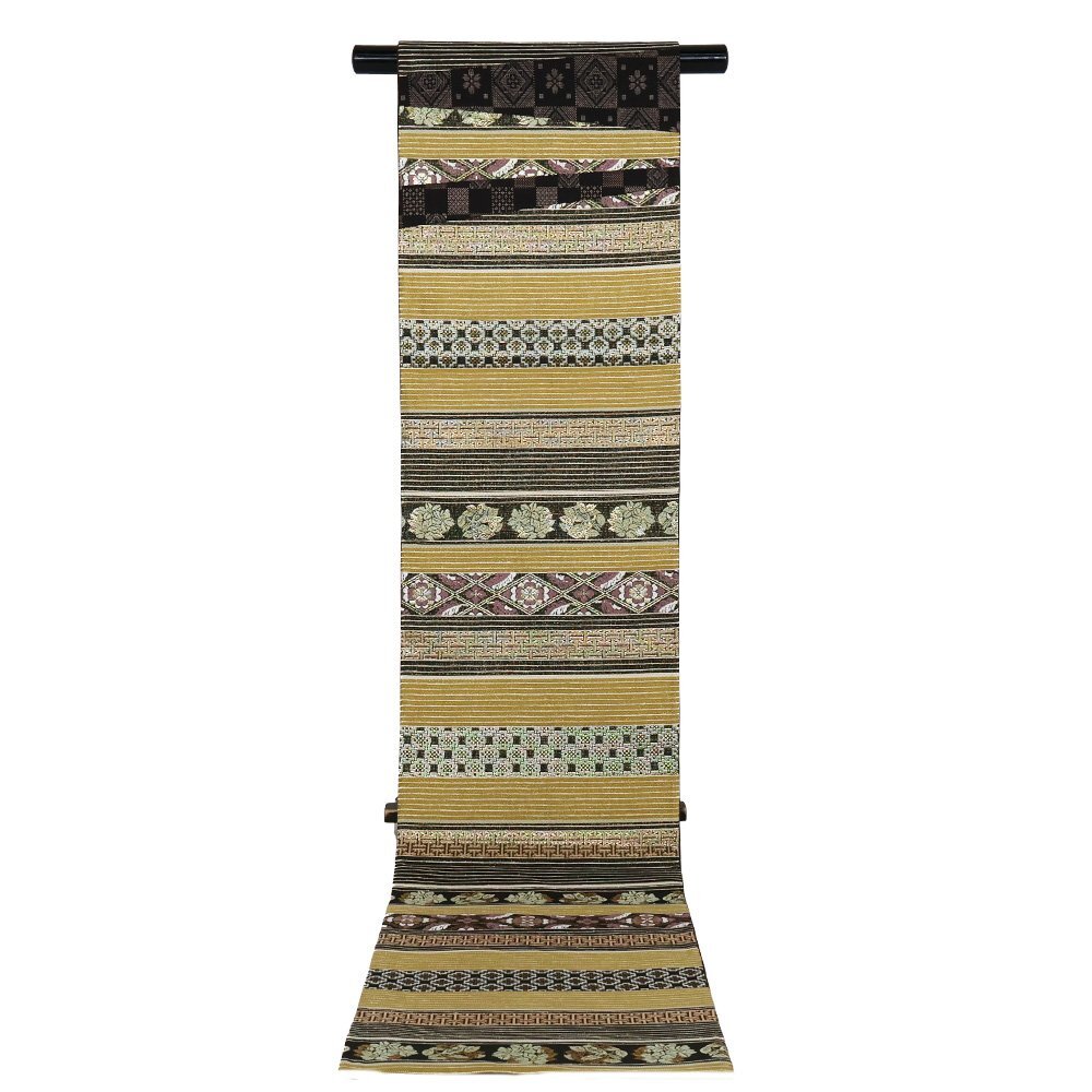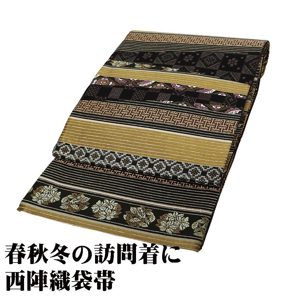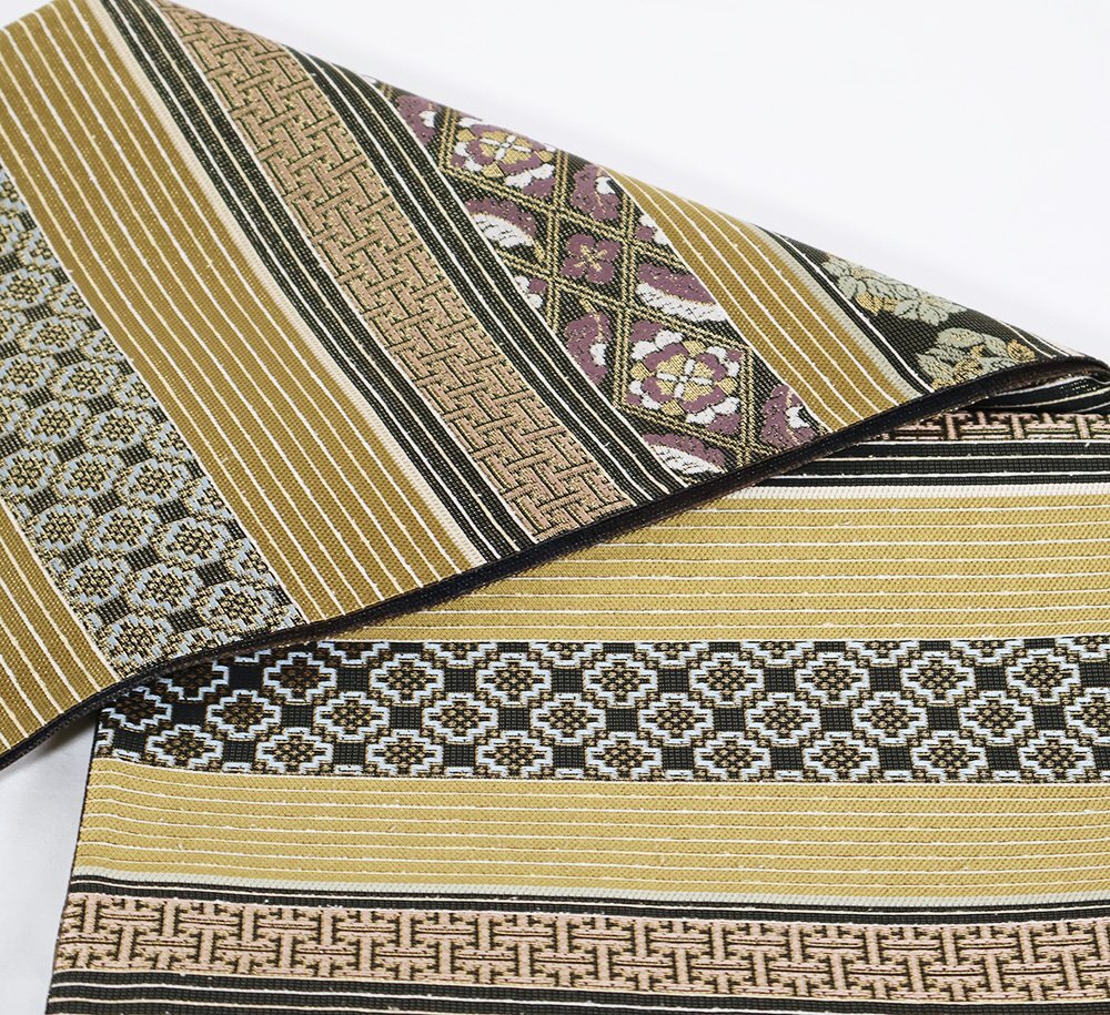 | 西陣織袋帯 両方向全通 片側:きりばみ・泥大島紬 三通 片側:黄土色・金・黒・紫地 正倉院文様・名物裂・唐花・花菱文様 新品 仕立て上がり |