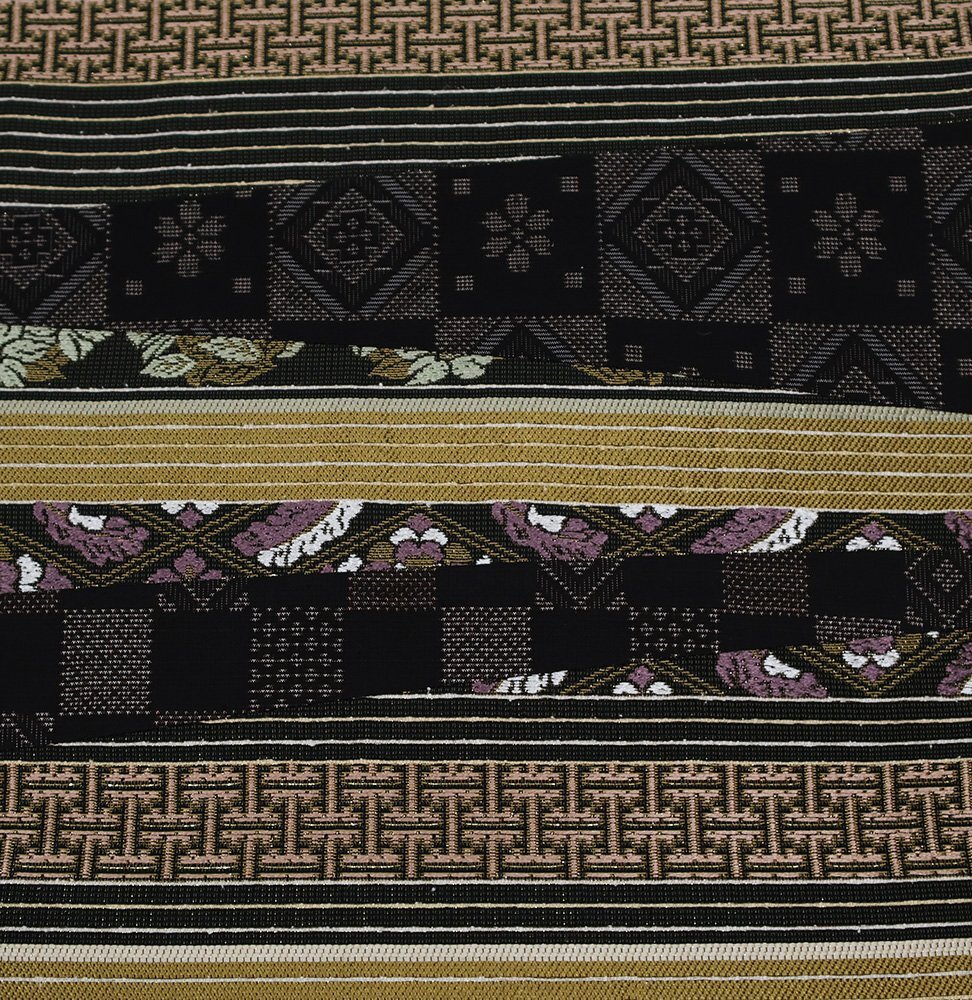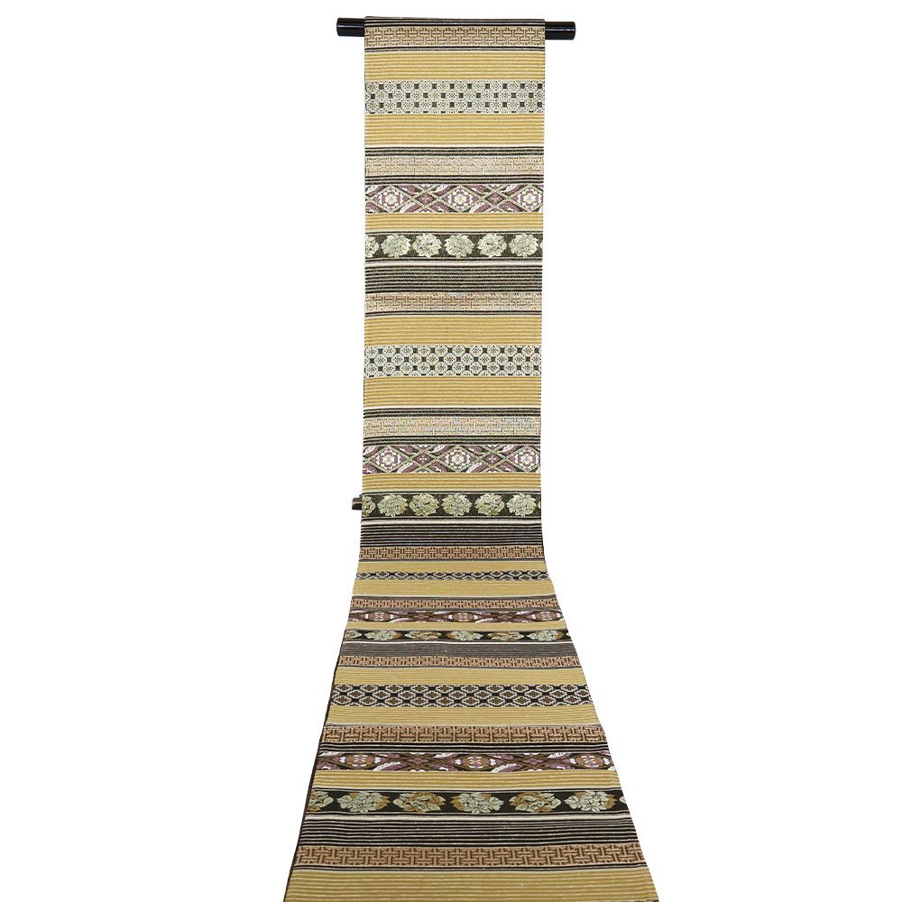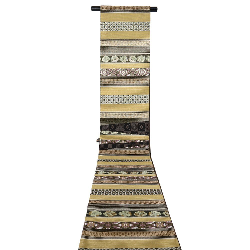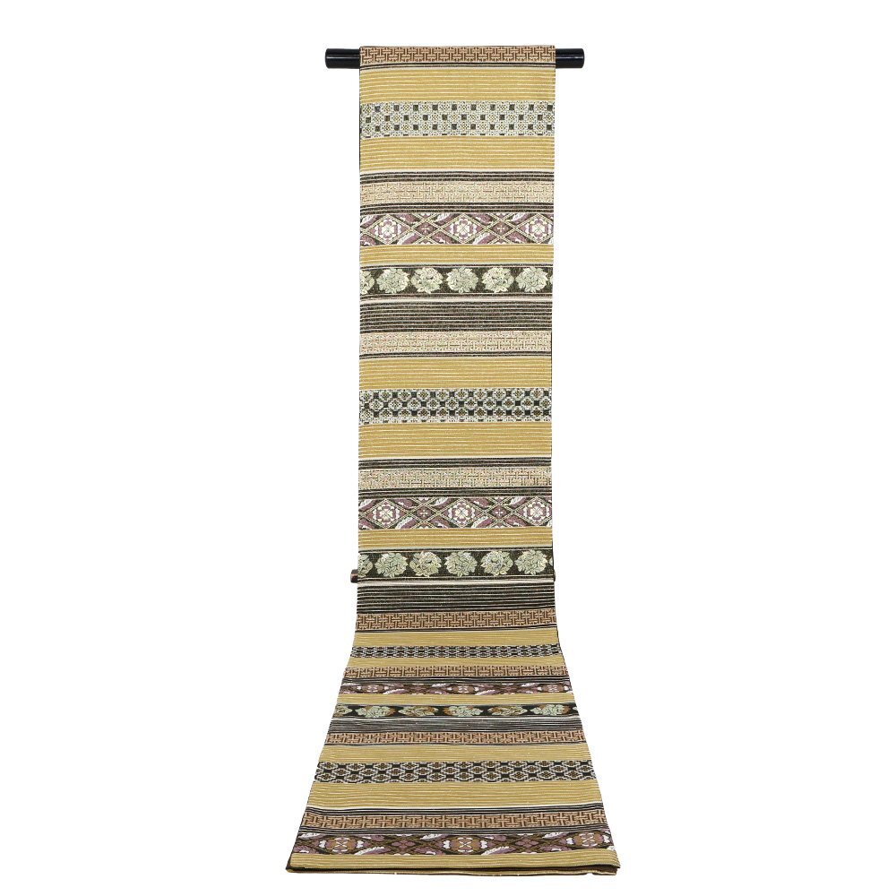 | 西陣織袋帯 両方向全通 片側:きりばみ・泥大島紬 三通 片側:黄土色・金・黒・紫地 正倉院文様・名物裂・唐花・花菱文様 新品 仕立て上がり |