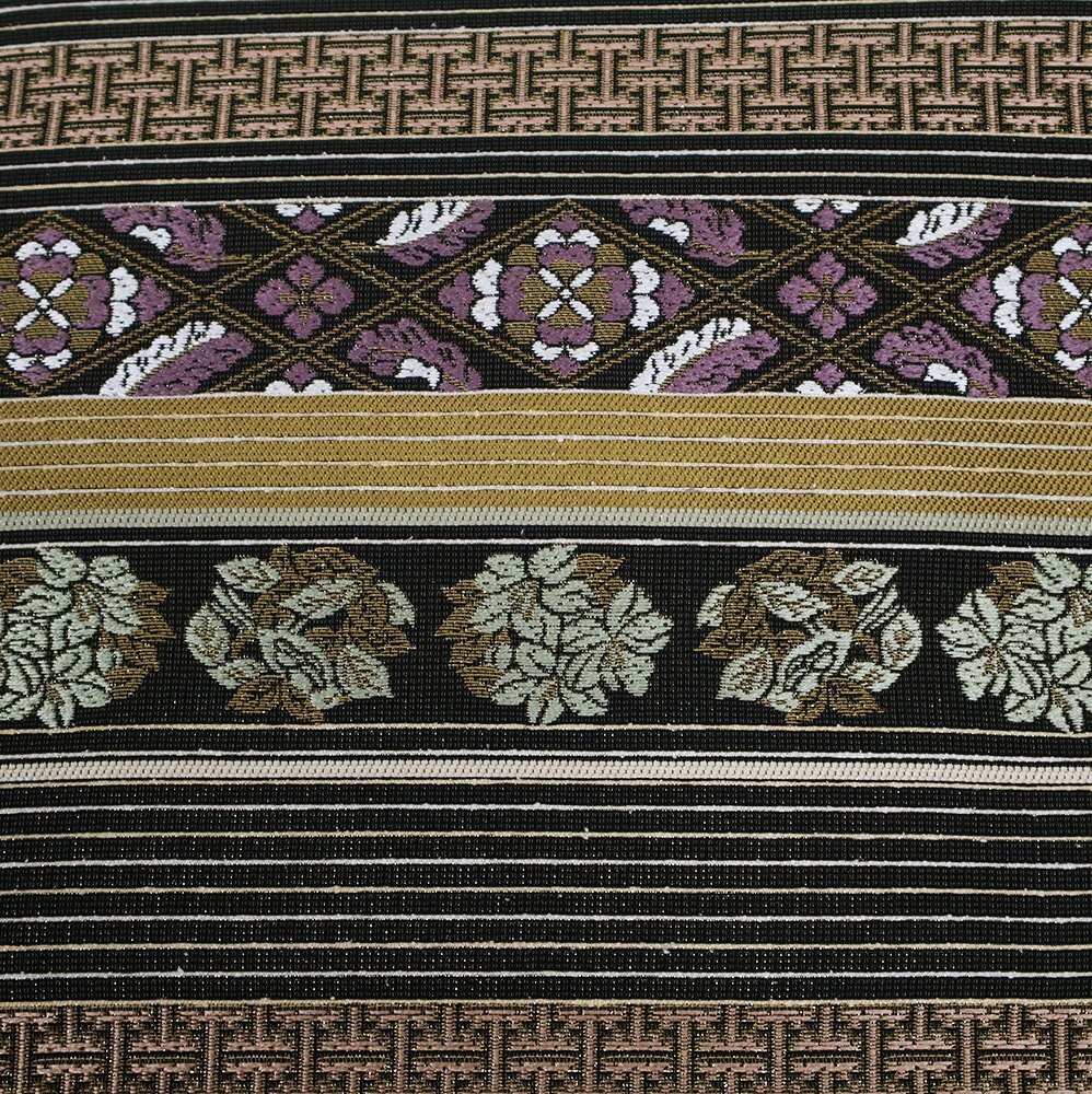 西陣織袋帯 両方向全通 片側:きりばみ・泥大島紬 三通 片側:黄土色・金・黒・紫地 正倉院文様・名物裂・唐花・花菱文様 (写真では上手く色が出ない場合があります。ご了承下さい) ※お使いのディスプレイの種類や設定の差により 実物の色と画像の色が少々異なることもございます。 写真の枚数が多いので一度パソコンでご覧ください。 |
