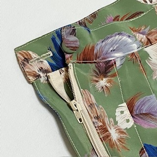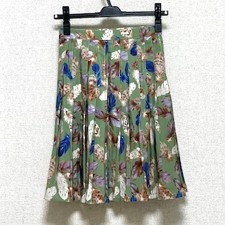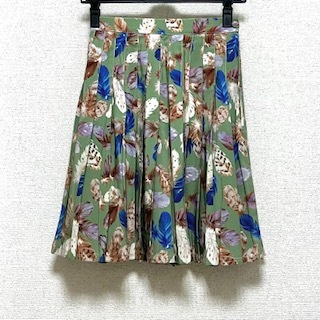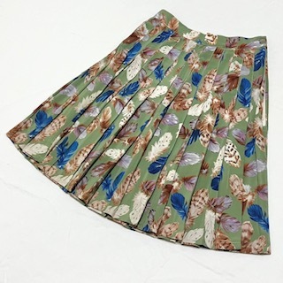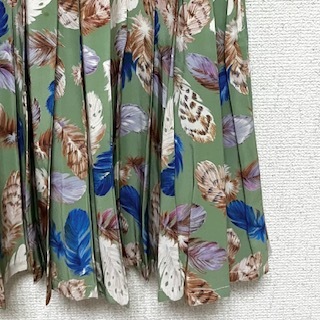 グリーン系の優しい色味に羽柄が素敵なプリーツスカートです。