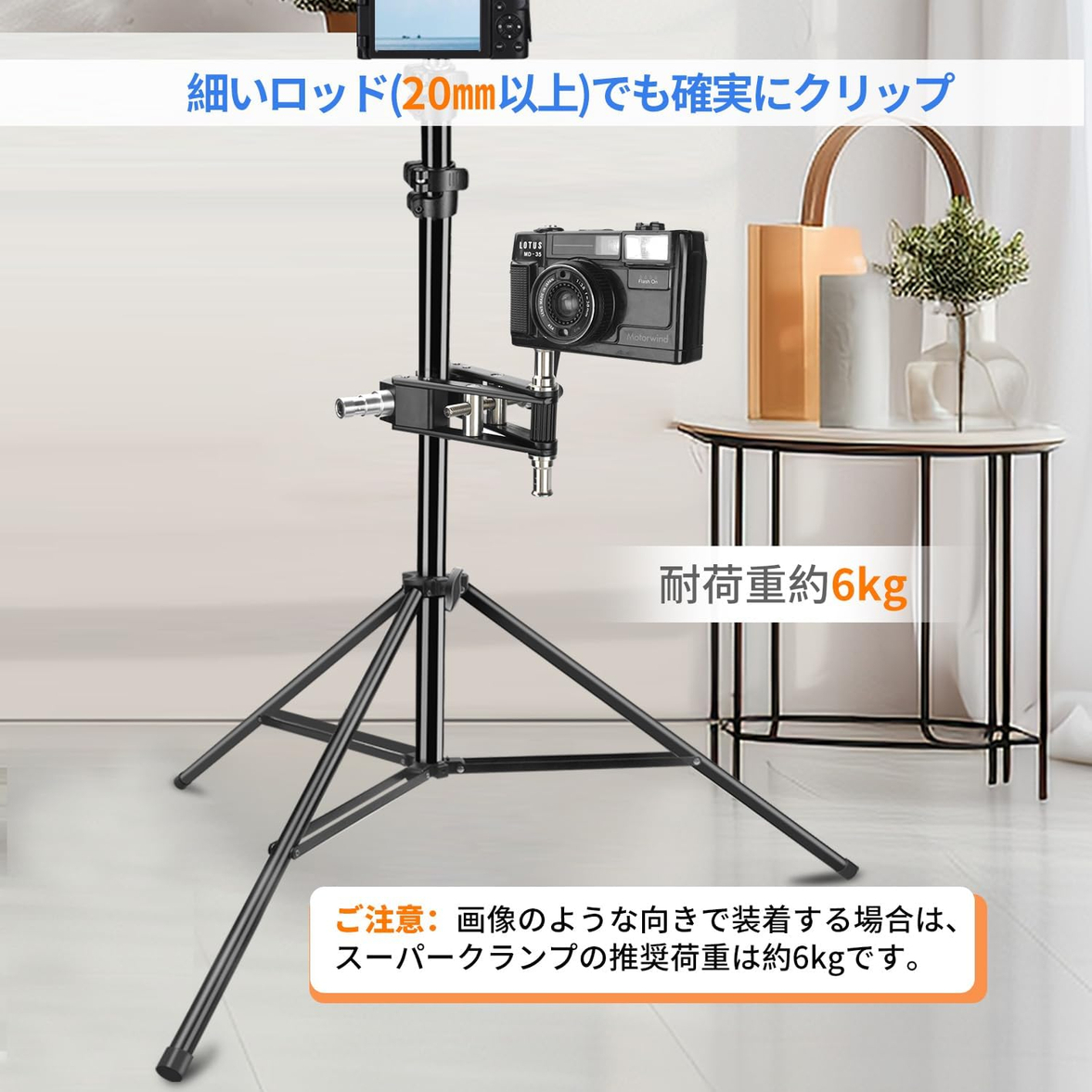 セット使用して、カメラアームスタンドの荷重を考慮したうえで、全キットの耐荷重は6kgまでです。