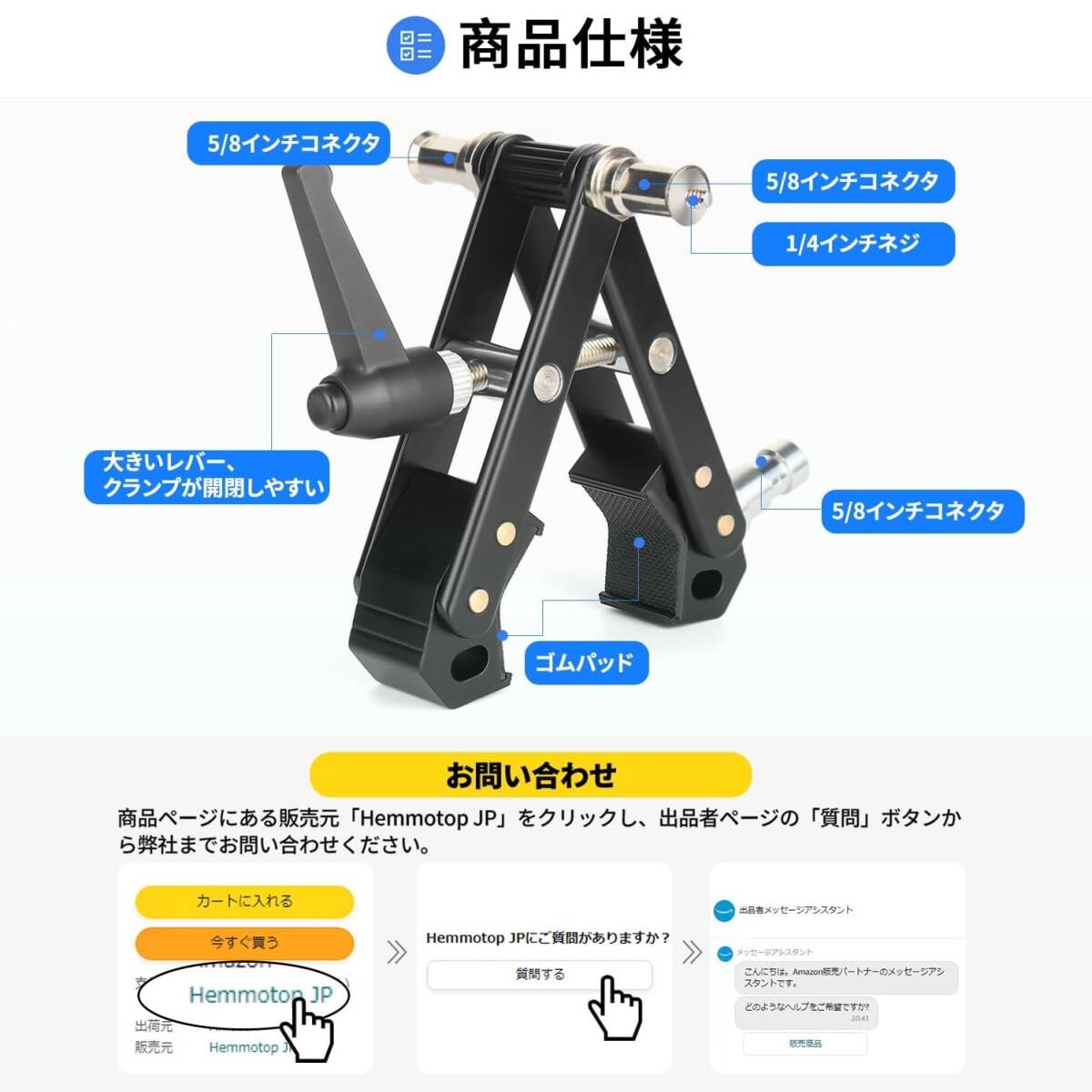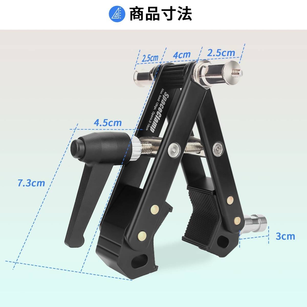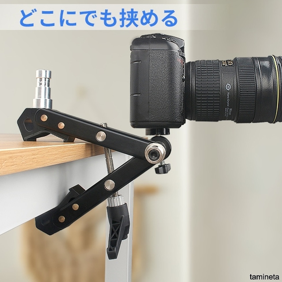 スーパークランプは今販売している弊社の万能カメラアームスタンド(製品asin: B0BBTDPP2W )を取り付けて、LED照明やリングライト、ビデオライト、ストロボ等の撮影機材を多角度調整可能です。