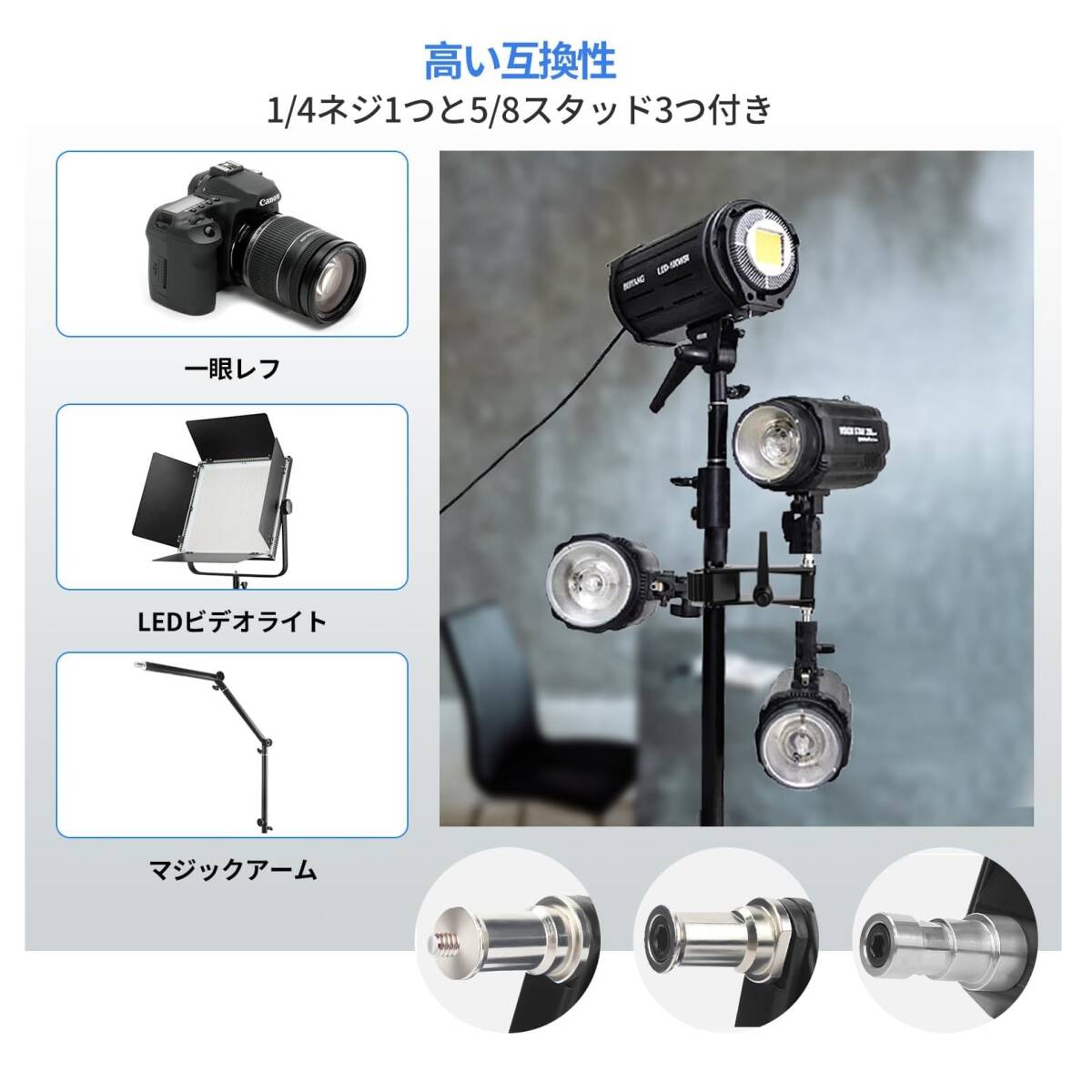 1/4ネジ1つと5/8スタッド3つ付き、一眼レフカメラやLEDビデオライト、リングライト、ソフトボックス、マジックアームなど1/4ネジ穴と5/8ネジ付きの撮影機材に対応可能です。