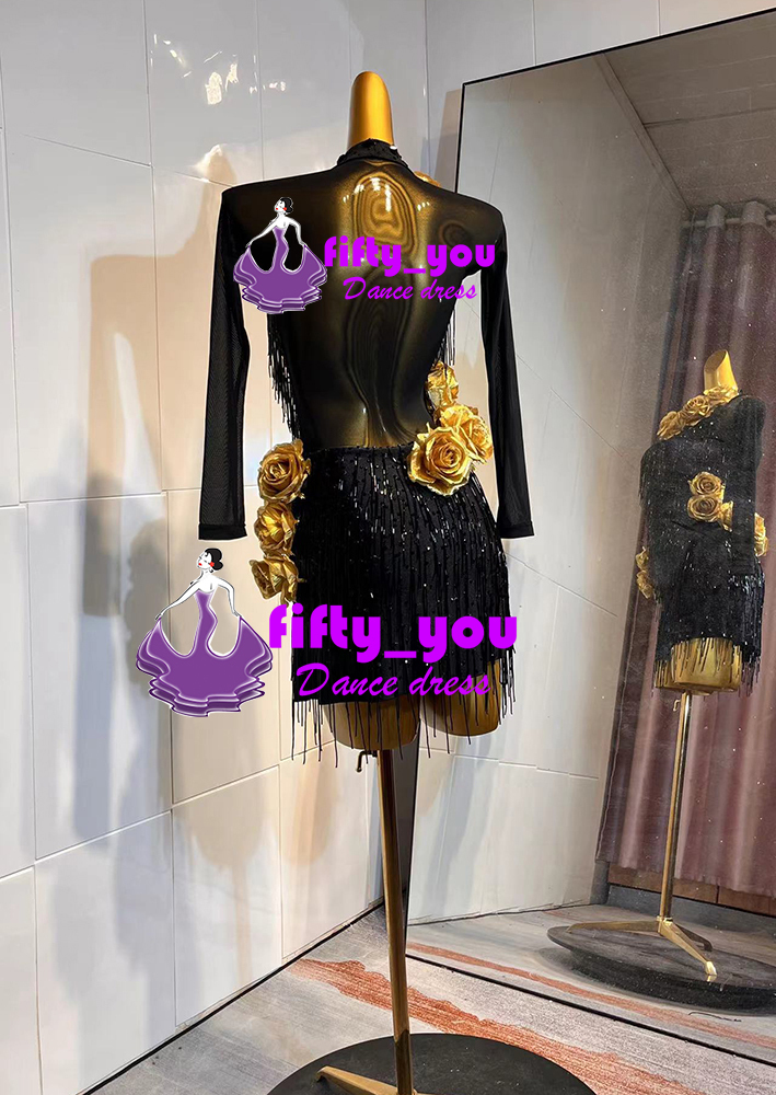 新品fifty_you 社交ダンス高級ドレス セミオーダー ラテン競技パーティードレス ビーズいっぱい飾 ゴージャスゴールド花付き ブラック