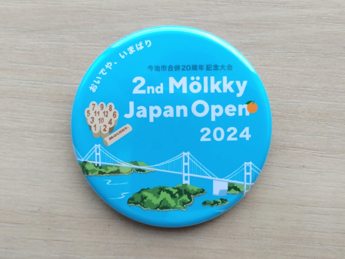 2024年6月1〜2日に愛媛県今治市で開催された、第2回モルックジャパンオープンの缶バッジ。