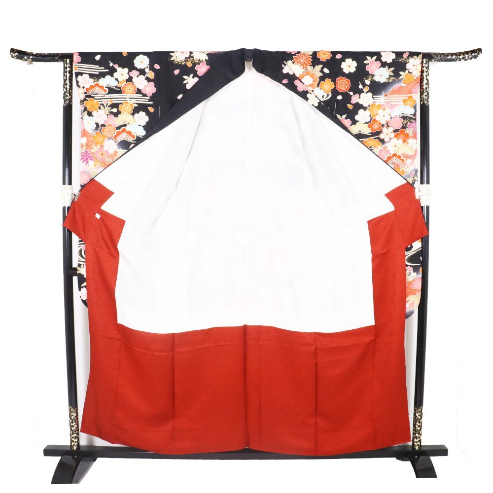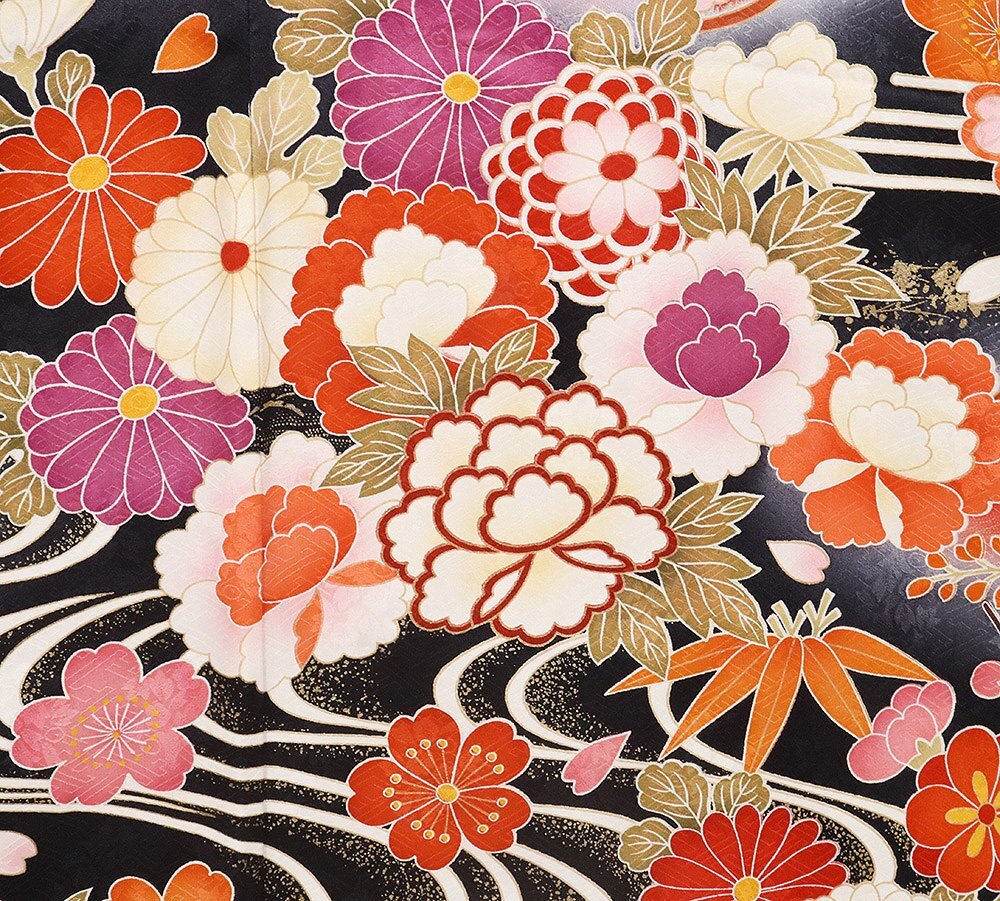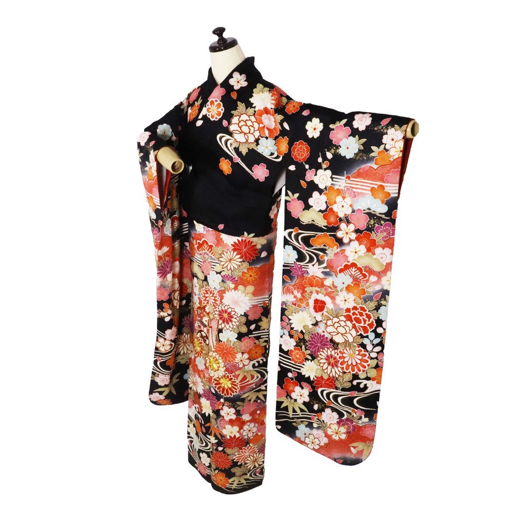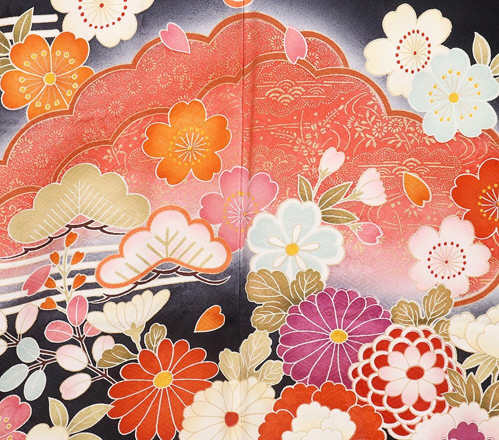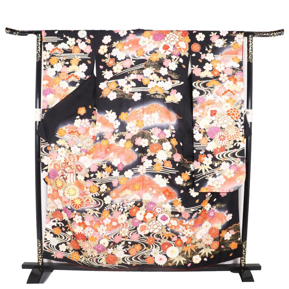 | 十日町友禅 本加工品 振袖 袷 丹後縮緬 黒暈し地 御所車 松竹梅・桜・牡丹・菊 164 広襟 | |