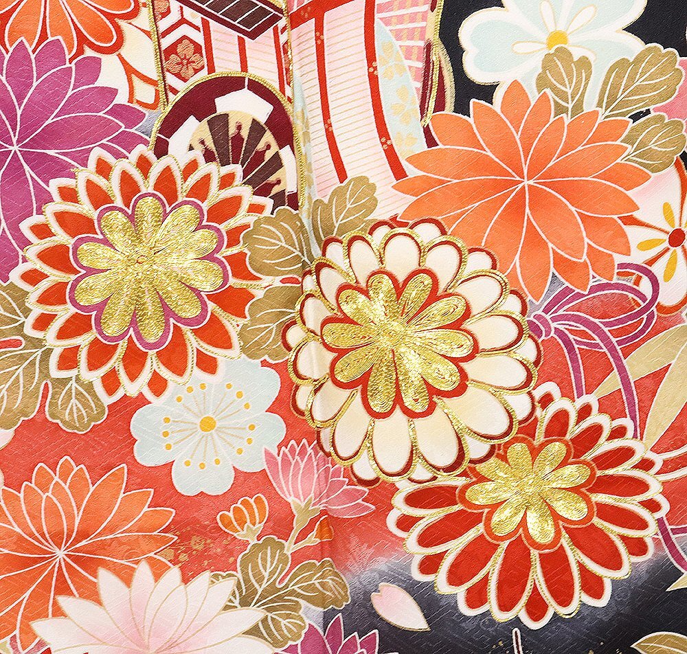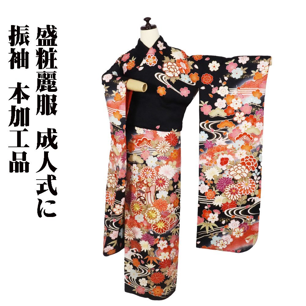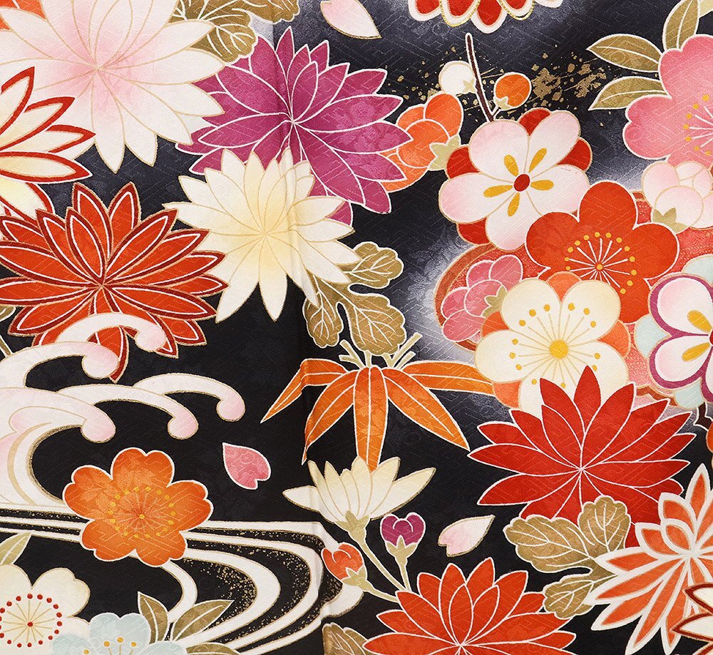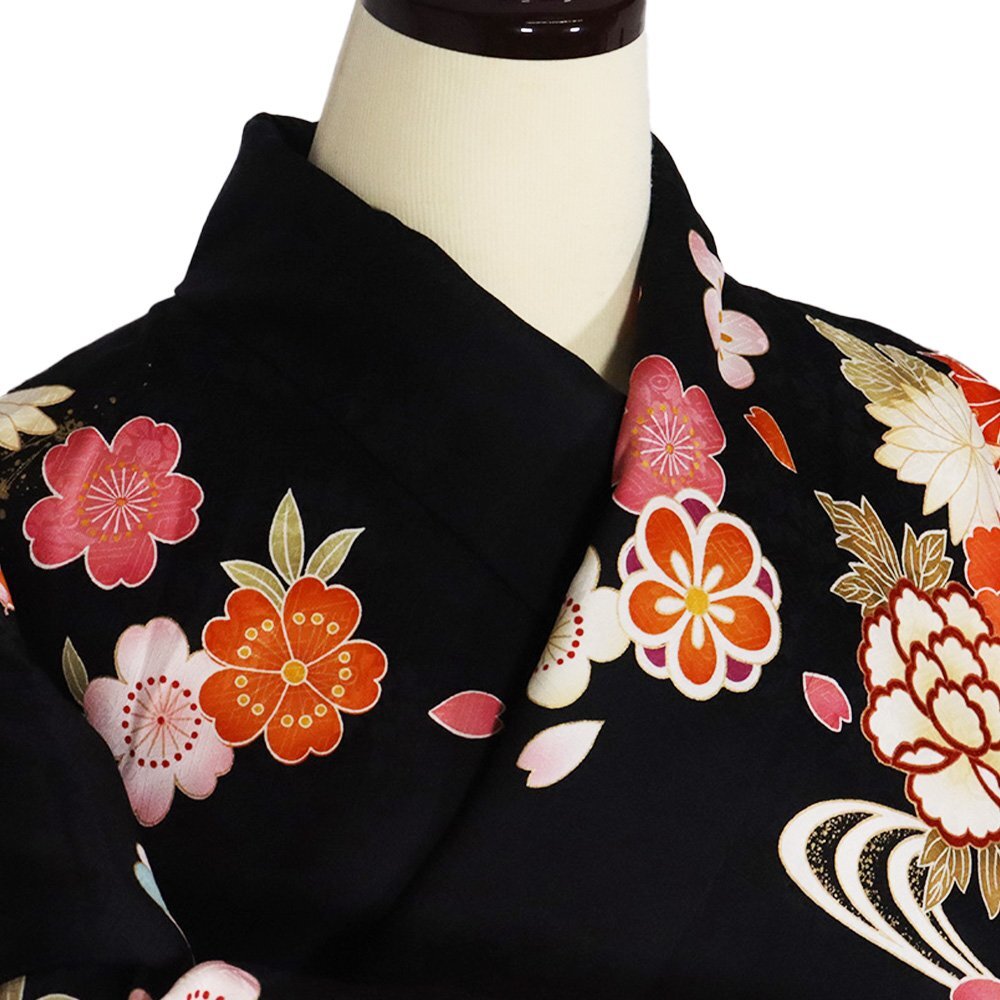 | 十日町友禅 本加工品 振袖 袷 丹後縮緬 黒暈し地 御所車 松竹梅・桜・牡丹・菊 164 広襟 | |