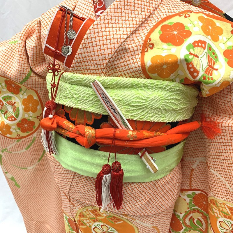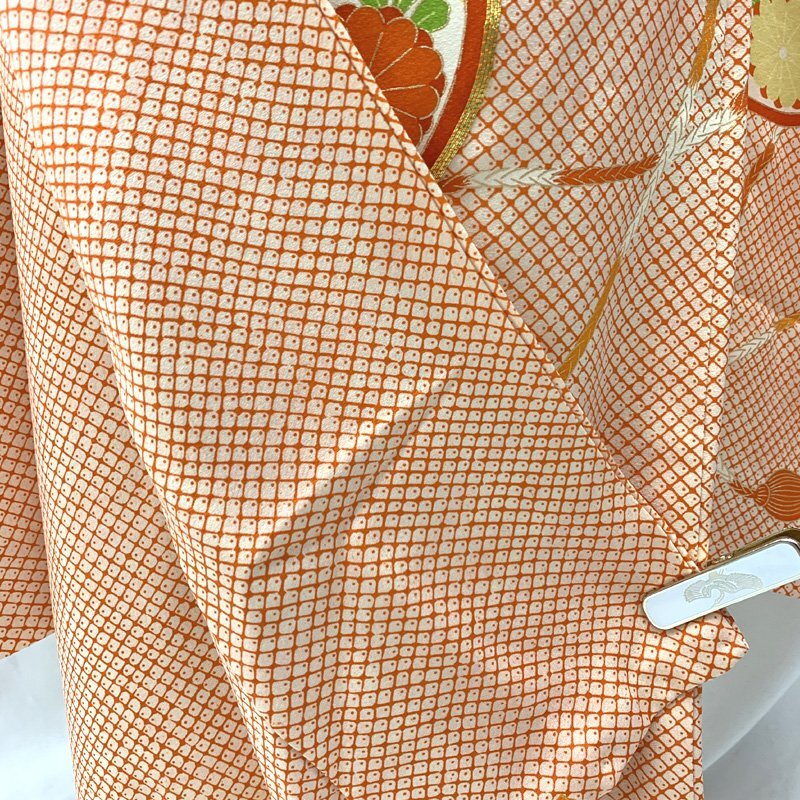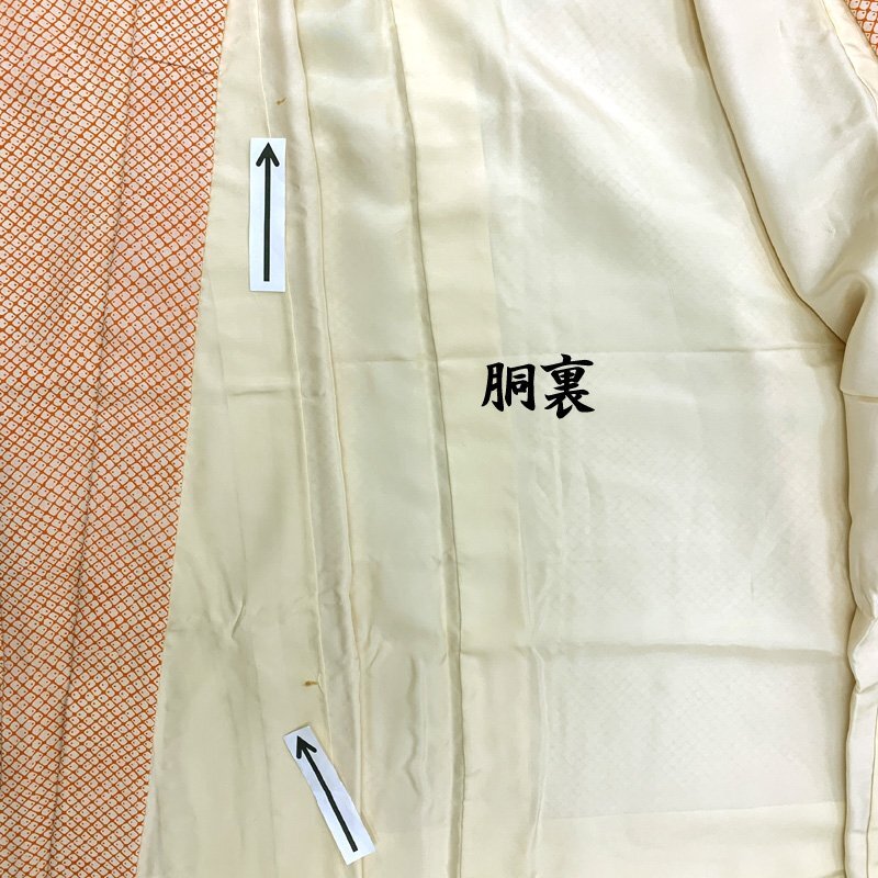 | □七五三 七歳 女児 着物&袋帯&長襦袢 金駒刺繍 朱色□状態良好 (No.n) 朱色地に鹿の子柄に、金駒刺繍が施された丸文が可愛らしい小柄な7歳のお子様の七五三のお着物と袋帯のセットです(その他の、ベレー帽・付け衿はセットに含まれません)。※おまけで長襦袢をお付けします 身丈が短めなので、5歳、小柄な7歳のお子様にいかがでしょうか。七五三終了後は、お正月やお節句にもご使用いただけます。袴と合わせてハーフ成人式や小学校の卒業式にもご利用いただけます。 お小物類(帯揚げ、帯締め、しごき、筥迫、末広)をご希望の方はおまかせとなりますが、別途6000円頂戴します。 (着物)身丈短めサイズ。肩上げをしておりませんので、お子様の裄丈に合わせてお直しをお願いします。右外袖の矢印部分に、シミがございますが、遠目からみたらあまり目立ちません。 (長襦袢)袖丈の合うものをおまけでおつけいたしますが、中古品のためシミ汚れがある場合がございます(素材はお選びいただけません)。 (帯)特に目立つシミやダメージはございません。 【素材】(着物)正絹、(帯)正絹 【色】朱色 *モニターによって色味は実際と異なる場合がございます。 【サイズ】(着物) 裄:56cm、肩上げ:0cm、袖幅:30cm、袖丈:71cm、丈(肩から):113cm、腰上げ:0cm、前幅:20cm、後幅:26cm (帯) 幅:26cm、長さ:392cm *素人採寸のため、多少の誤差はご容赦ください。 お求め安い価格での出品ですので、いかがでしょうか? | |