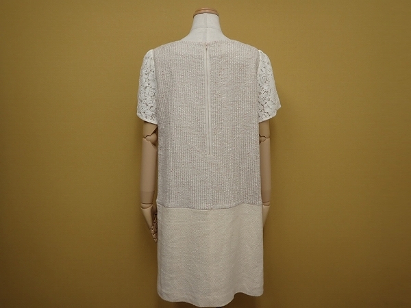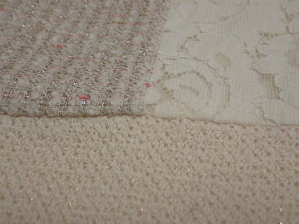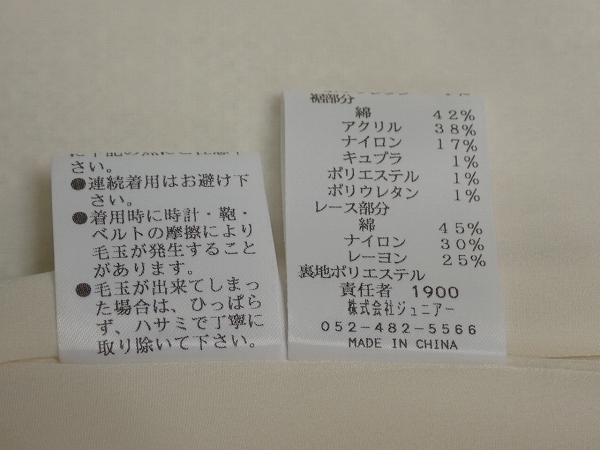 | 色 ベージュ×オフホワイト 素材 表地 本体 レーヨン36% アクリル26% ナイロン16% コットン12% キュプラ6% ポリエステル3% ポリウレタン1% 袖部分 コットン42% アクリル38% ナイロン17% キュプラ1% ポリエステル1% ポリウレタン1% レース部分 コットン45% ナイロン30% レーヨン25% 裏地 ポリエステル | |
