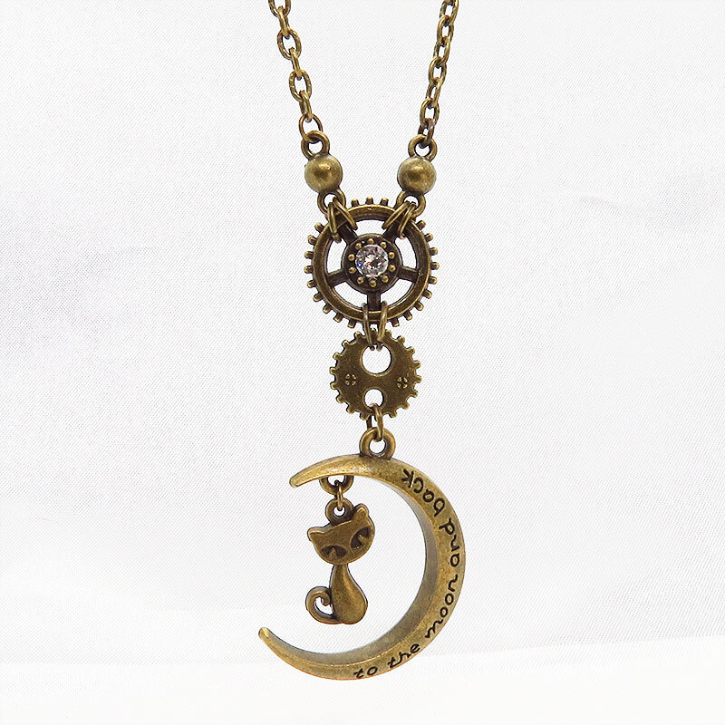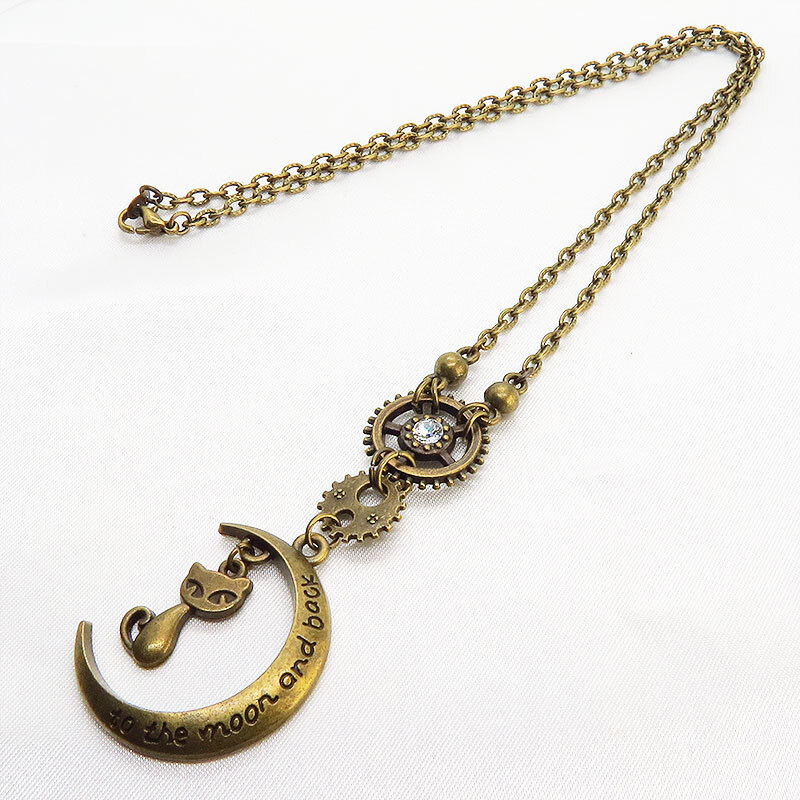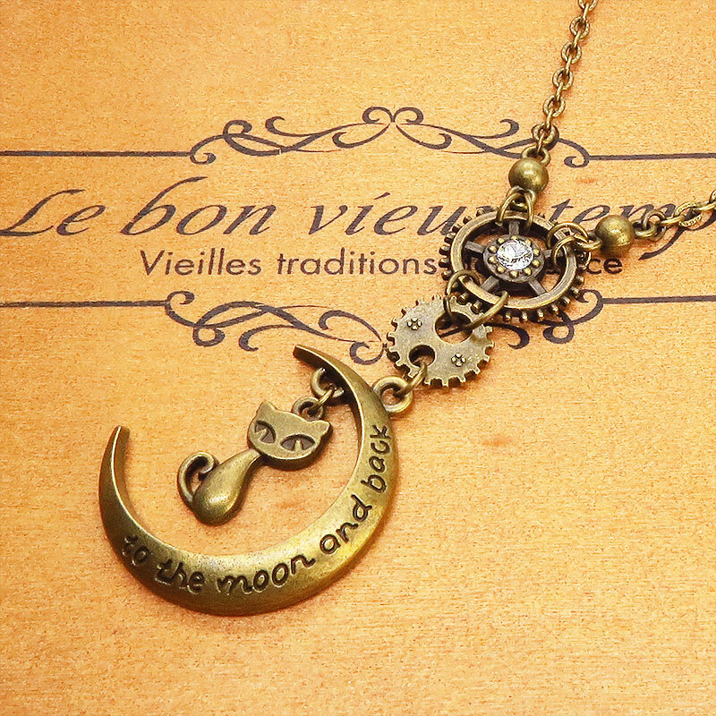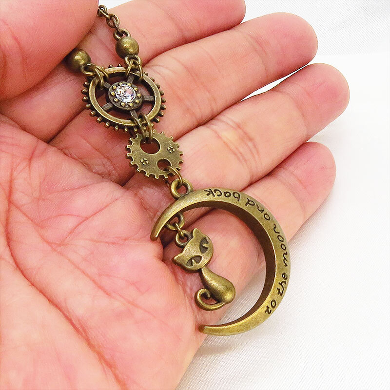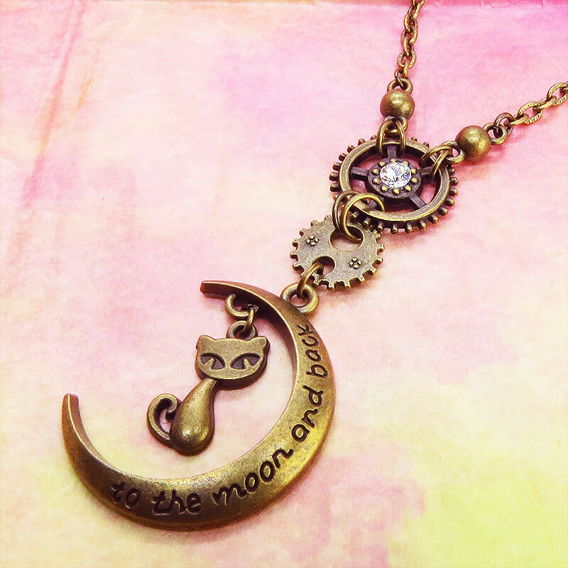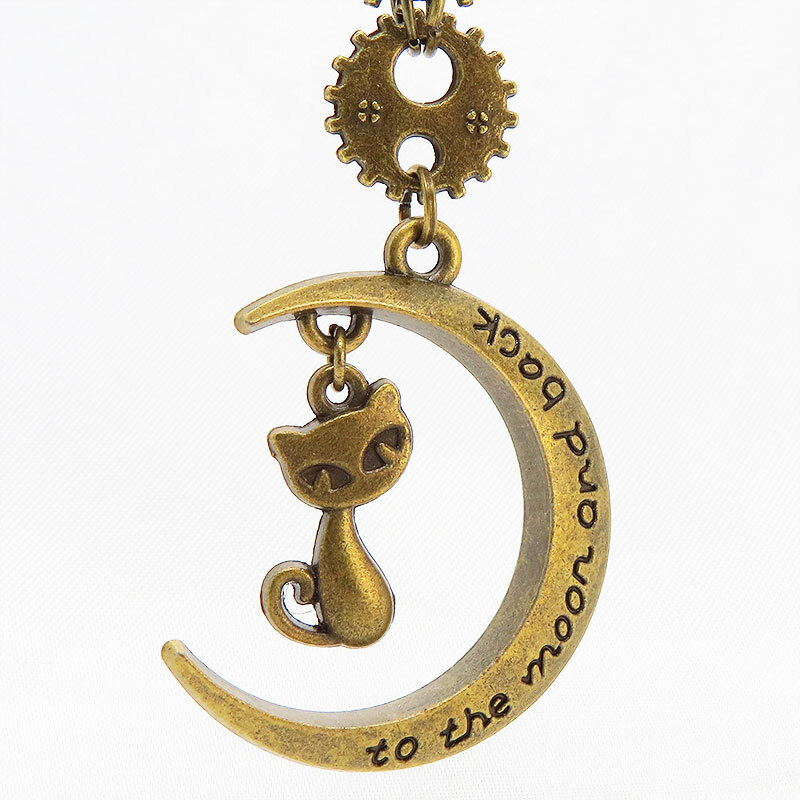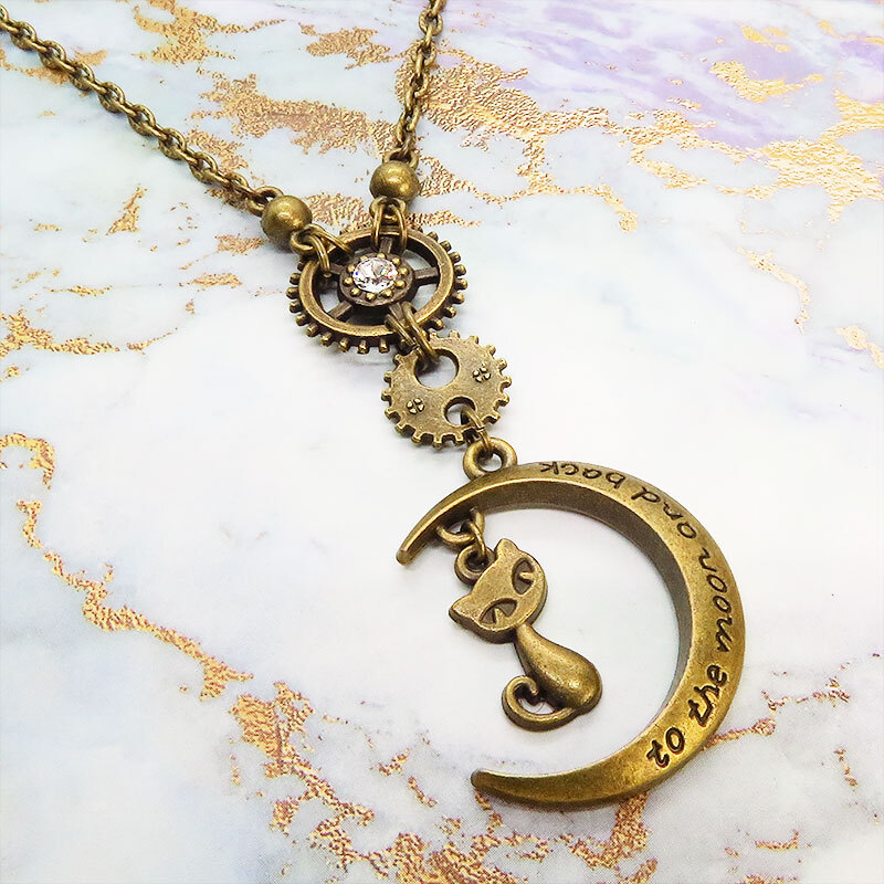 アンティークゴールド 猫と三日月と歯車のスチームパンク風ネックレス スワロフスキー 長さ調整可