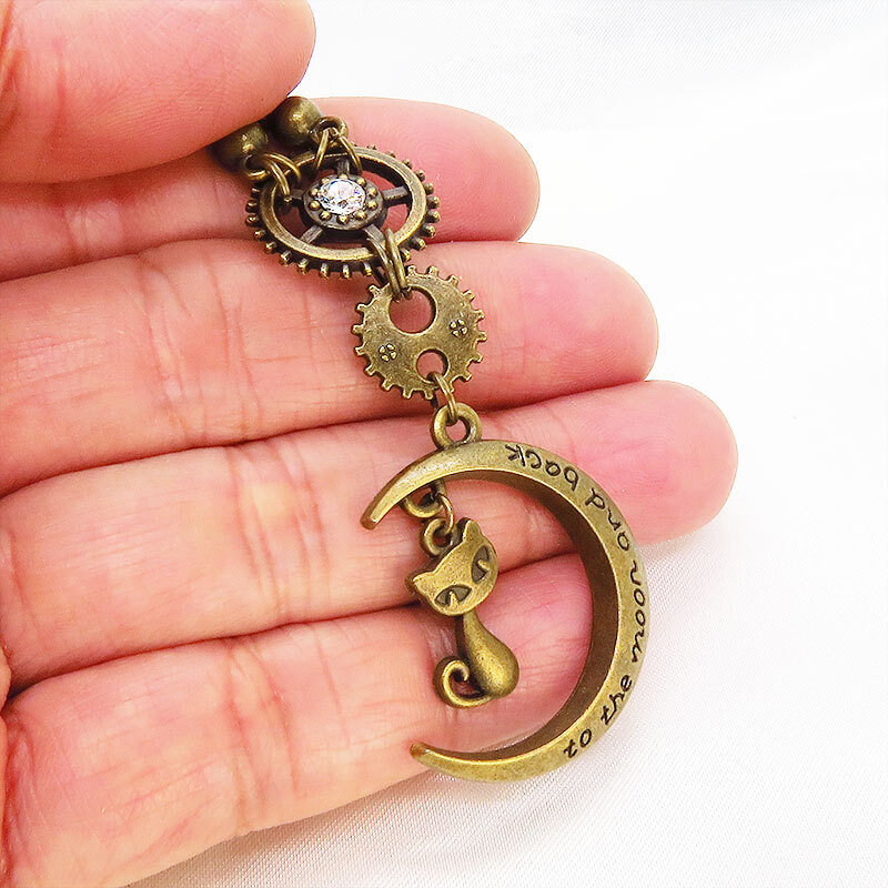 大小異なる形状の歯車を使いスチームパンクの風合いを演出し、三日月には猫をつり下げ、どこか懐かしさを感じさせるデザインはあなたの心を惹きつけます