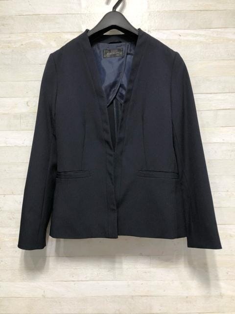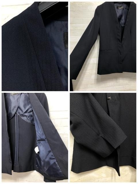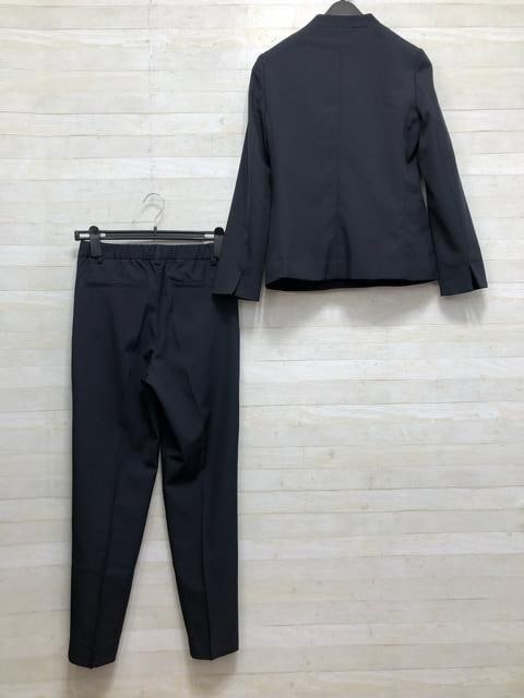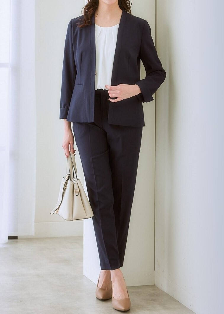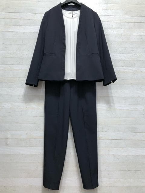 新品☆7号S紺系♪ノーカラー&テーパードパンツスーツ3点セット〇p921