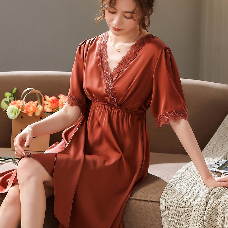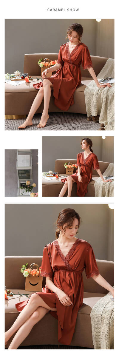 ネグリジェ ルームワンピース ナイトウェア 華やか エレガント 膝上丈 重ね裾 キャラメル色