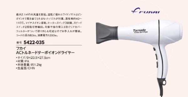 【商品番号】 5422-035 【商 品 名】 フカイ ACトルネードターボイオンドライヤー |