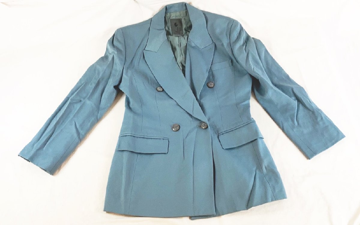 ELLE エル サックスブルー系 ダブルジャケット 9ARサイズ 右前衿中央に薄いシミあり OF-7