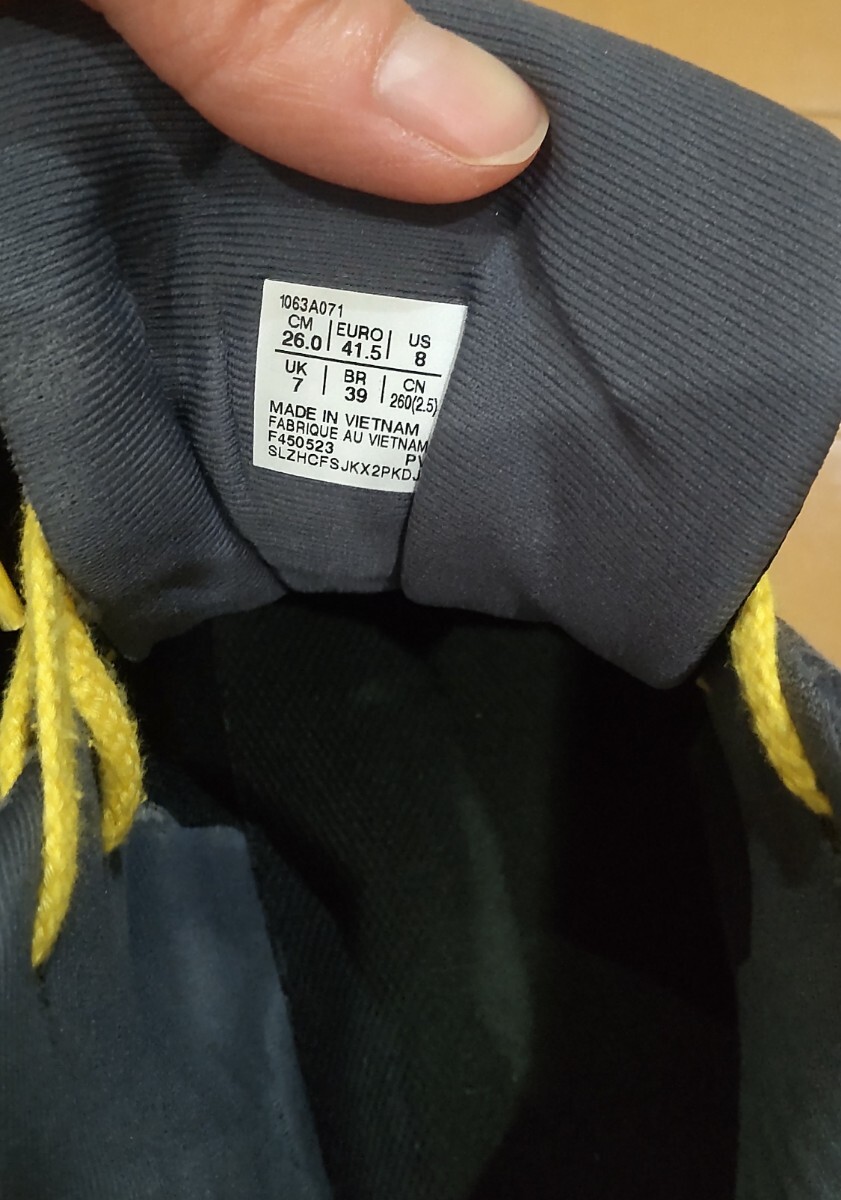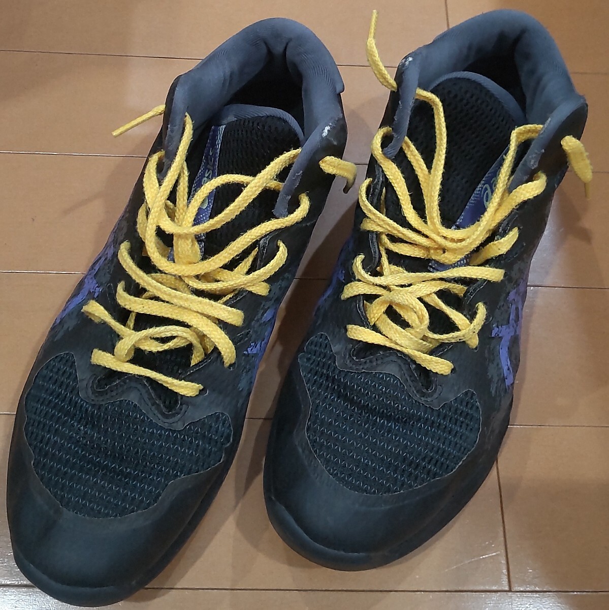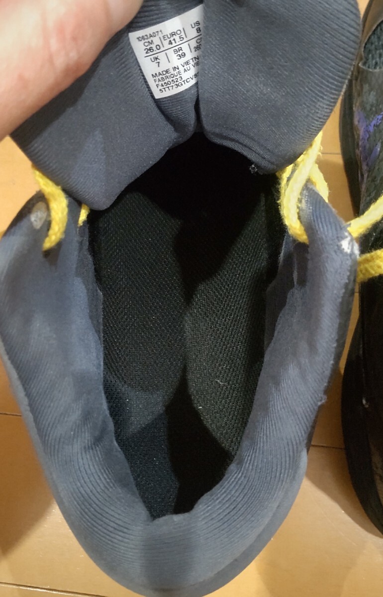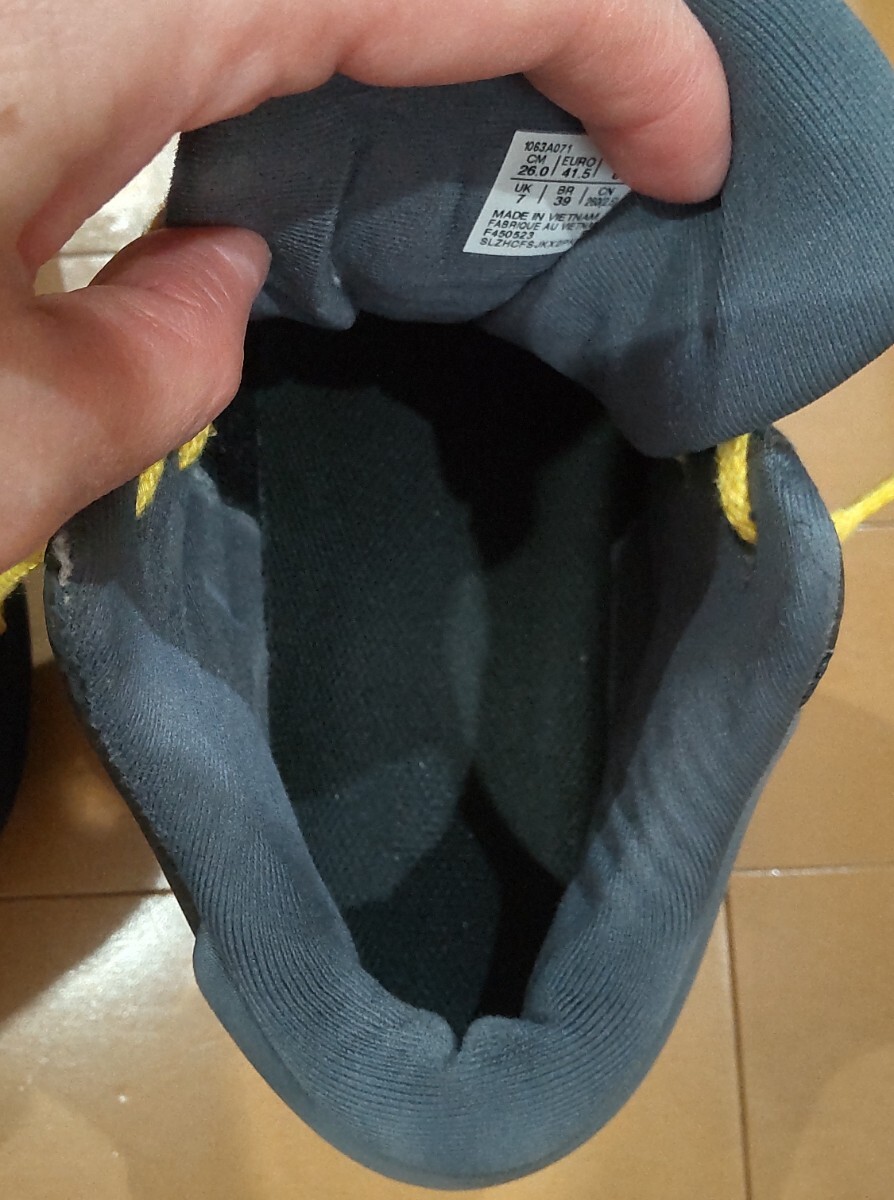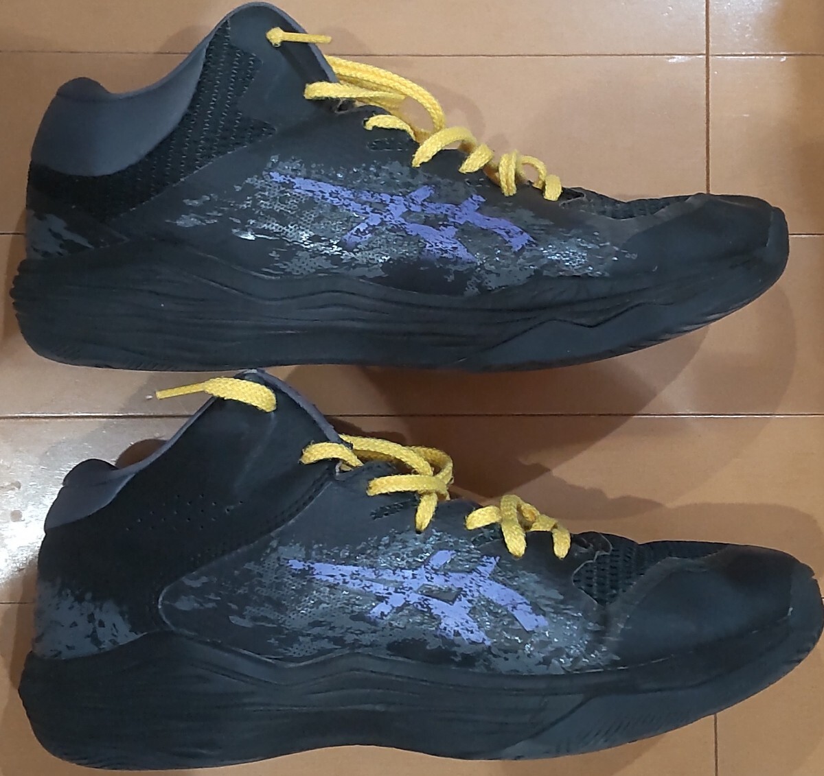 レイカーズカラー風に紐を黄色にかえました。見た目はきれいですが一年使用したので傷や汚れありにしました。インソールだけ洗って足底や周りもきれいにふいてから発送いたします。毎回消臭スプレーをかけたりして大事にしてたのできれいなのかと思います。