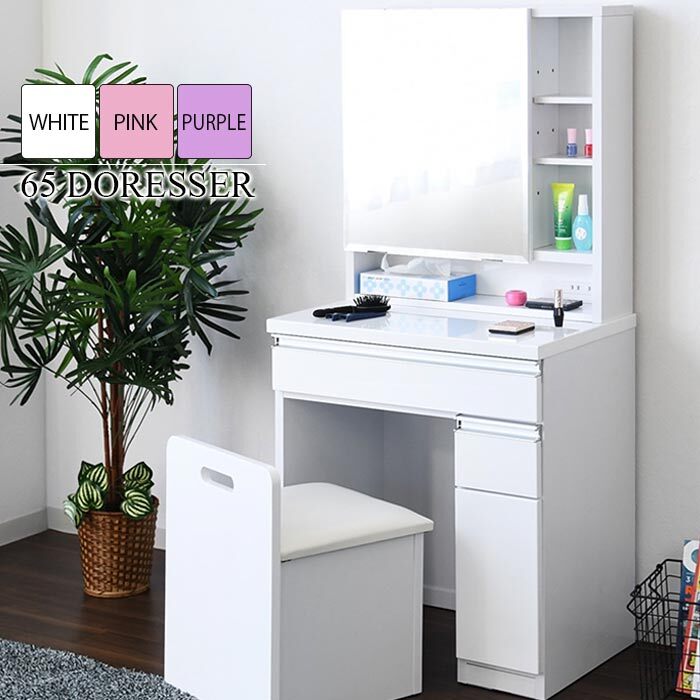 特  徴かわいいピンク・パープル、おしゃれなホワイトから選べる1面鏡ドレッサー・スツールセット。ミラー裏はメイク用品などの収納ラック付きでコンパクトながら大容量収納。