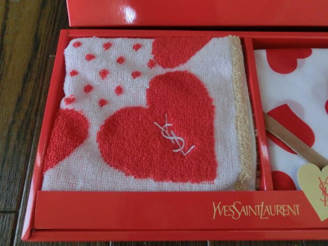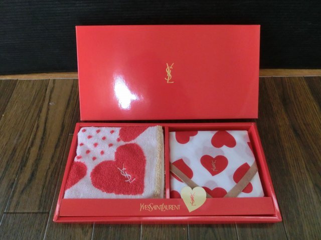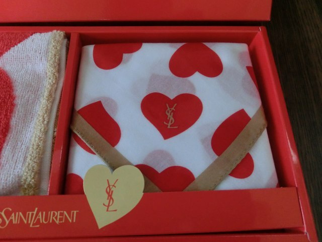 ♪♪【6L9⑤f】YSL イヴサンローラン タオル&ハンカチ2枚 赤×白ハート ギフト 箱付き 未使用♪♪