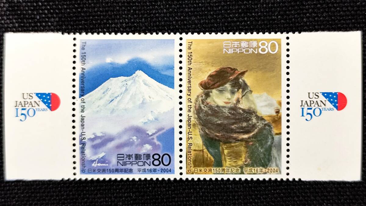 [24121123]【日米交流150周年記念】2種連刷 耳紙付「富士山・カフェ」80円×2 2004年発行 美品