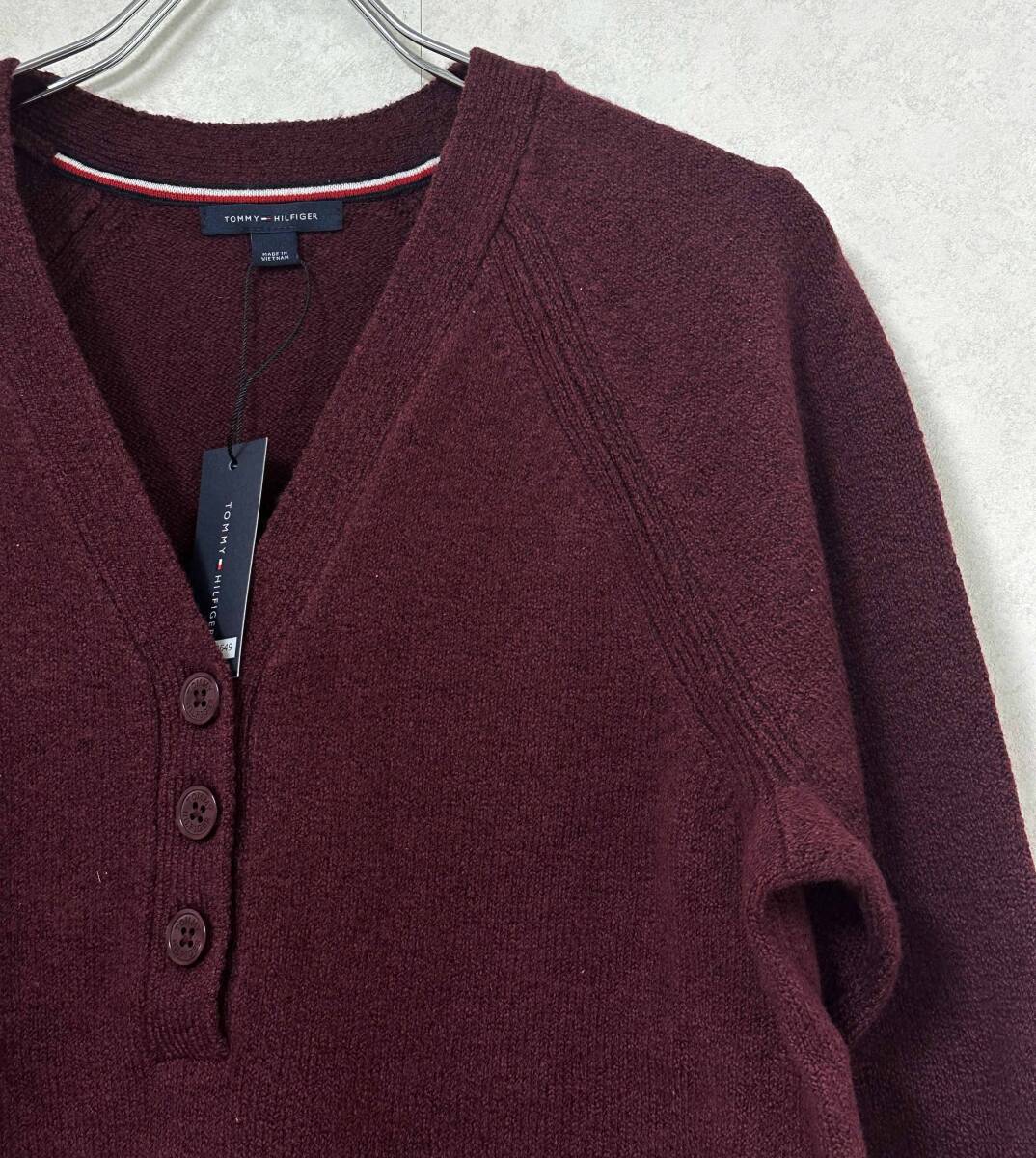 新品 L ★ TOMMY HILFIGER トミーヒルフィガー ヘンリーネック コットン セーター US-M ボルドー オーバーサイズ プルオーバー Vネック