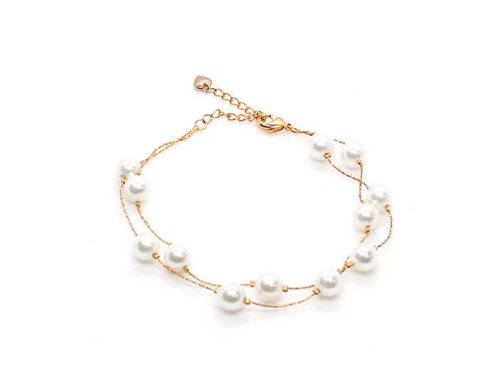 シンプルなチェーンにフェイクパールをあしらったフェミニンな二連ブレスレット。サイズ調整もOK、華やかなゴールドカラーですので、腕時計やブレスレットなど他の手持ちアクセサリーと重ね付けしてオシャレを楽しむのも◎。自分へのご褒美はもちろん、誕生日プレゼント、お返しギフト、母の日、記念日など、大切な人への贈り物にもおすすめです。【素材】プラスチック/ステンレス【サイズ】18~22cm(サイズ調整可)【カラー】パール/ゴールド◆関連ワード◆レディース アクセサリー ブレスレット 二連 パール ゴールドチェーン 華奢見え バレンタイン ホワイトデー 結婚式 誕生日 母の日 限定 通販 デート プレゼント 二次会 パーティー イベント 掲載画像は可能な限り実物に近づけておりますが、ブラウザ環境により色合いの見え方に誤差が出る場合がございます。 こちらの商品は店頭販売も同時に行っているため掲載中でも実店舗に在庫切れの場合ございます。何卒ご了承願います。