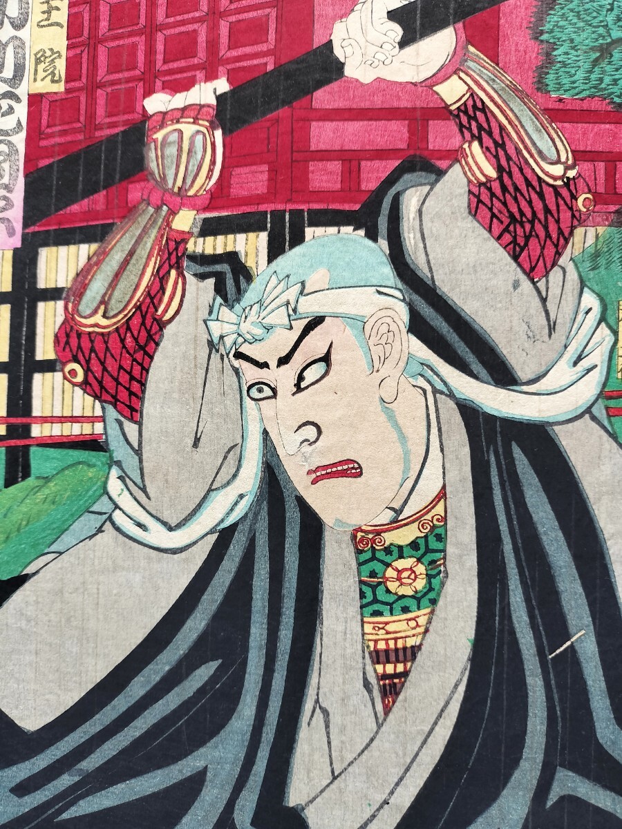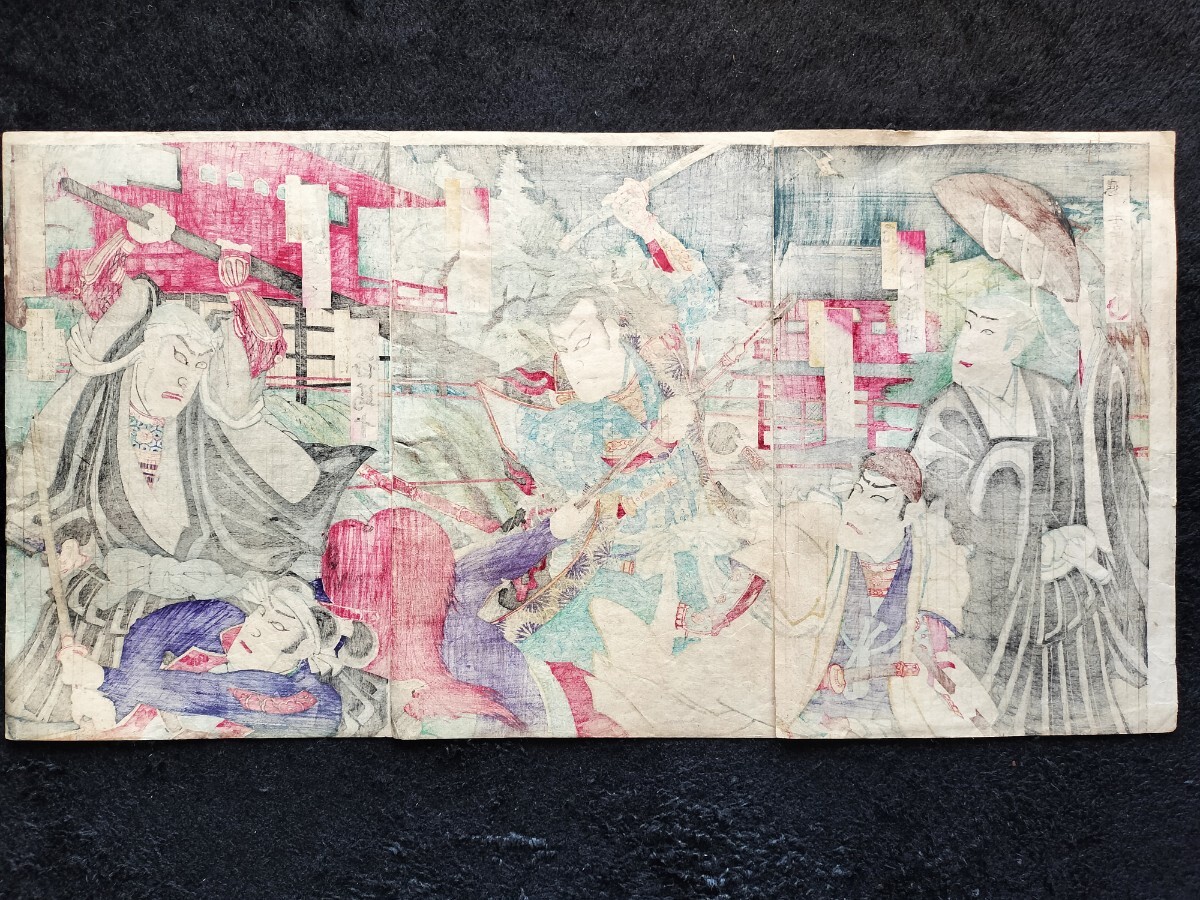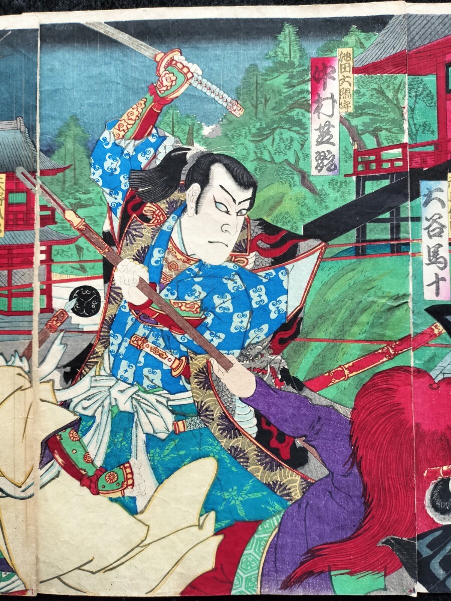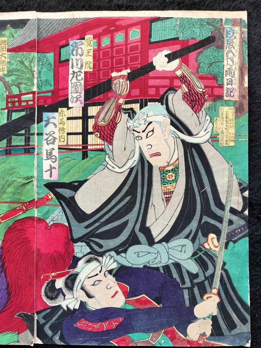 【真作】明治期 本物浮世絵木版画 歌川国貞「戍辰正月両日記」役者絵 武者絵 大判 錦絵 保存良い 三枚続