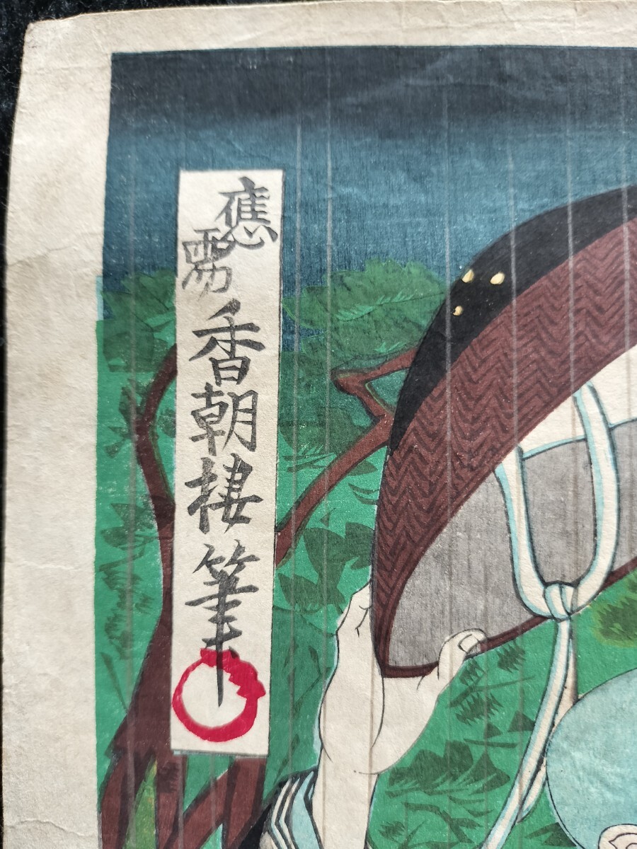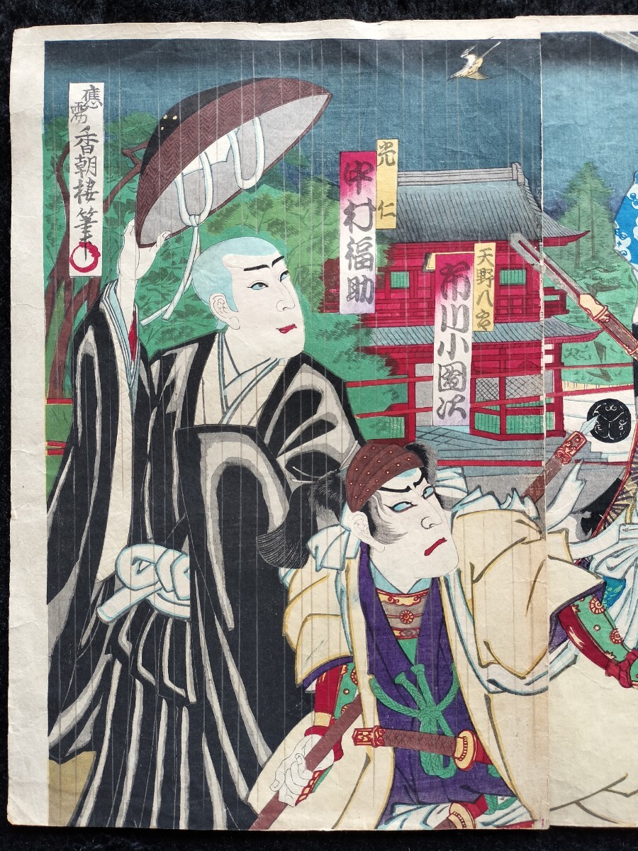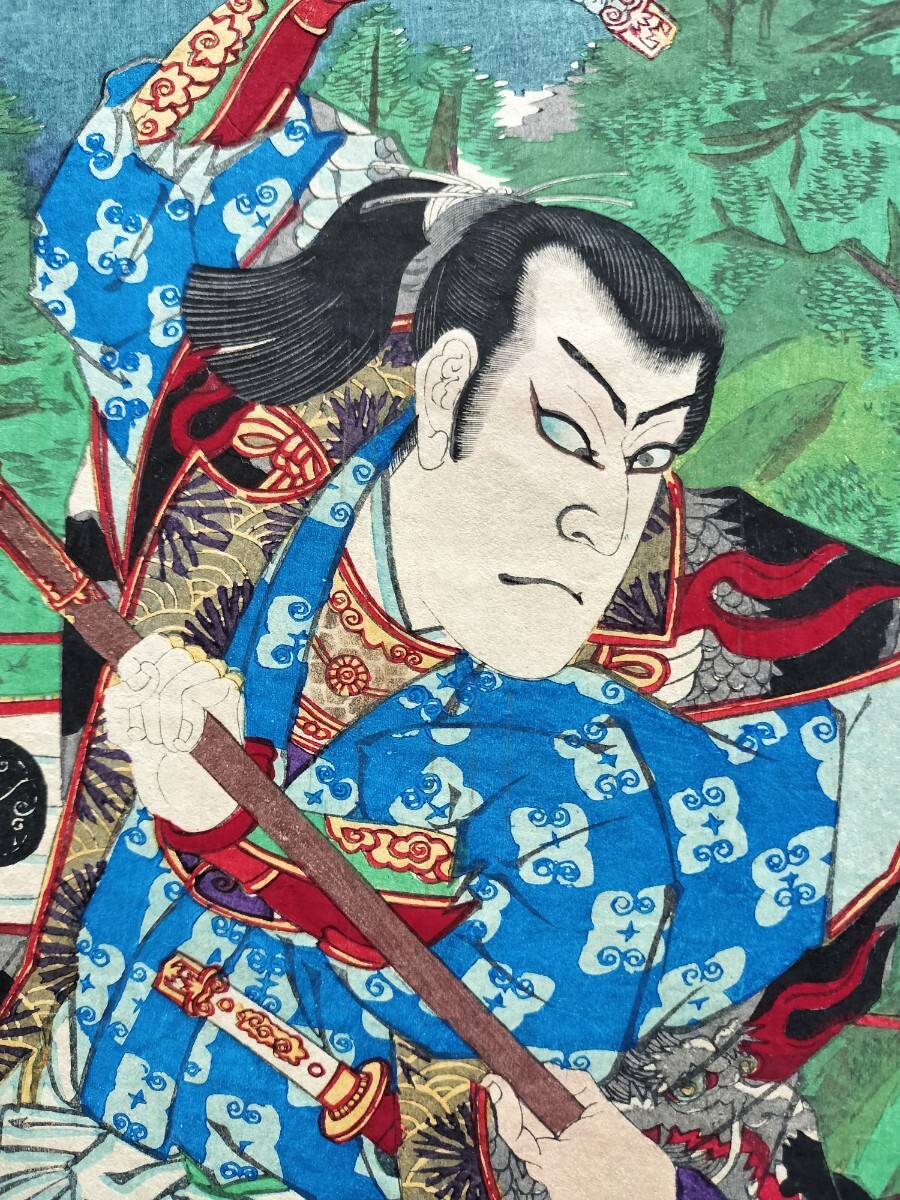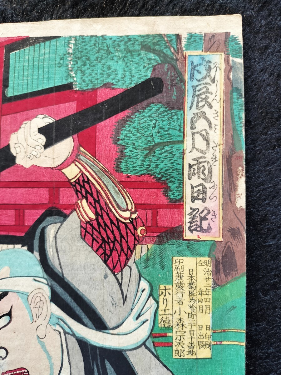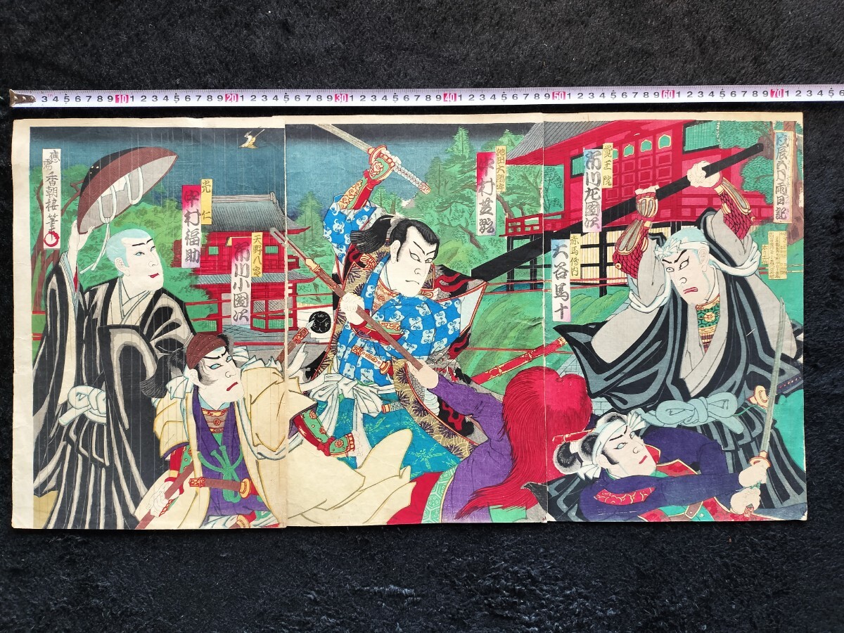 【真作】明治期 本物浮世絵木版画 歌川国貞「戍辰正月両日記」役者絵 武者絵 大判 錦絵 保存良い 三枚続