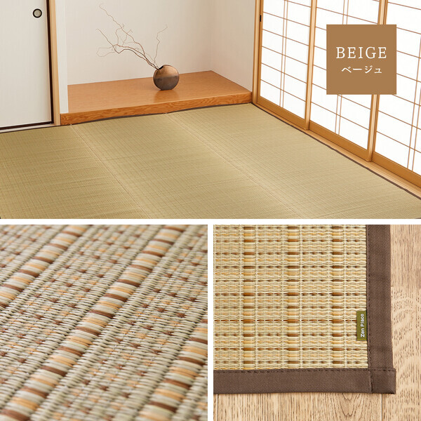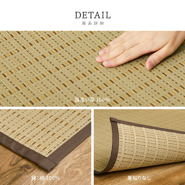 い草の「染」にもこだわり、職人の業で鮮やかな色合いに染め上げました。 シンプルなデザインで涼しげな雰囲気を演出し、 い草のさらりとした肌ざわりと爽やかさが、 暑い夏にもぴったりな一枚です。 国産い草ならではの重量感をあえて控えています。 軽くしなやかで手軽に敷きやすく、普段使いにもおすすめです。 表面は、い草の湿度調整機能でサラリと爽やかな肌触り。 い草の保温断熱効果で夏は涼しく、冬は暖かく、 空気浄化機能もあるので快適にご使用いただけます。 *ベージュの商品ページとなります 江戸間3畳 ■生産地:日本 ■素材・成分:表面:国産い草100%紋織 縁:綿100%四方縁 ※抗カビ 【商品について】 ・色止め加工をしていますが天然素材の為、色落ちすることがあります。 ・天然素材の為、カーペットシャンプー・洗剤などで拭いた場合変色することがあります。 ・湿気のある場所をお避け下さい。 ・抗カビ加工を施してありますが、天然素材の為、使用する状況によってはカビが発生することもあります。 ・ご使用前に乾いた布で拭いてください。 ・ラベル取り付けのタグピンは完全に取り除いてからご使用ください。 ・自然素材ですので、多少のサイズの誤差はご容赦願います。 ・滑りやすい場所でのご使用は、滑り止めの併用をお奨めします。 【画像について】 ・商品は、モニターによって色合いが異なって見える場合があります。 ----------- 着日指定をお受けすることができません 発送後、お問い合わせ番号をご連絡いたしますので 配送会社と調整をお願いいたします ----------- |