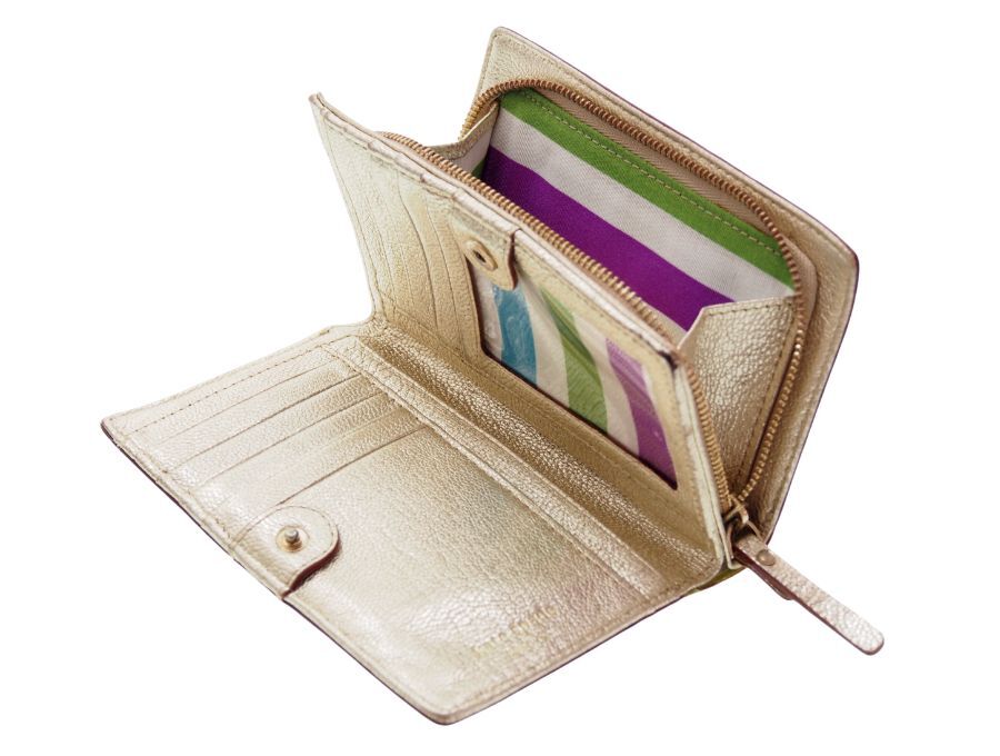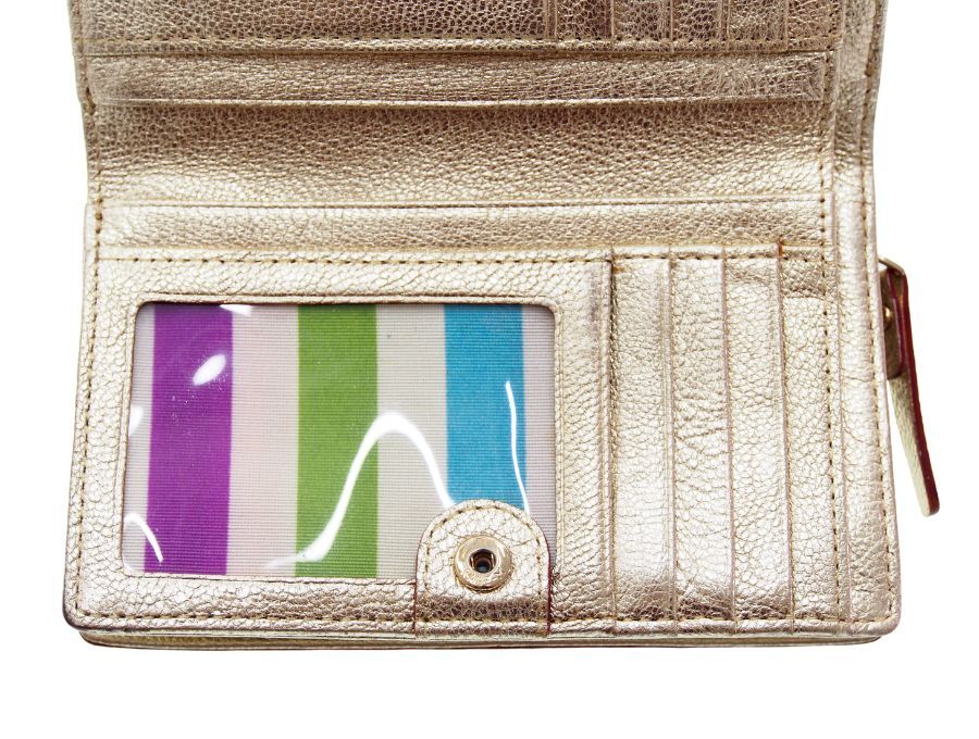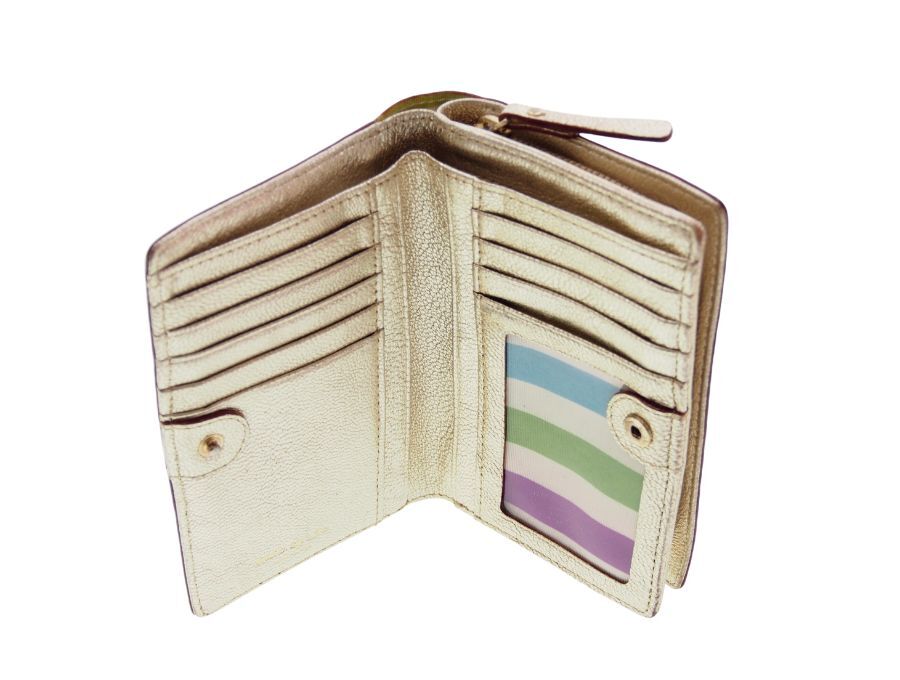 洗練されたデザインと抜群の収納力を誇る2つ折り財布「dara」には、お札入れやジップ式の小銭入れに加え、たくさんのカードスロットやスリットポケットを備えておりますので、散らかりがちなレシートやカードなども機能的に収められます。透明ビニール張りのIDウィンドウもついているので、定期や社員証もすっきり分けて収納できます。輝くメタリックレザーに施されたケイト・スペード ニューヨークのロゴが目を引き高級感が溢れるコンパクトウォレットで、内側生地のカラフルなストライプ模様が、ケイトスペードらしい仕上がりになっています。