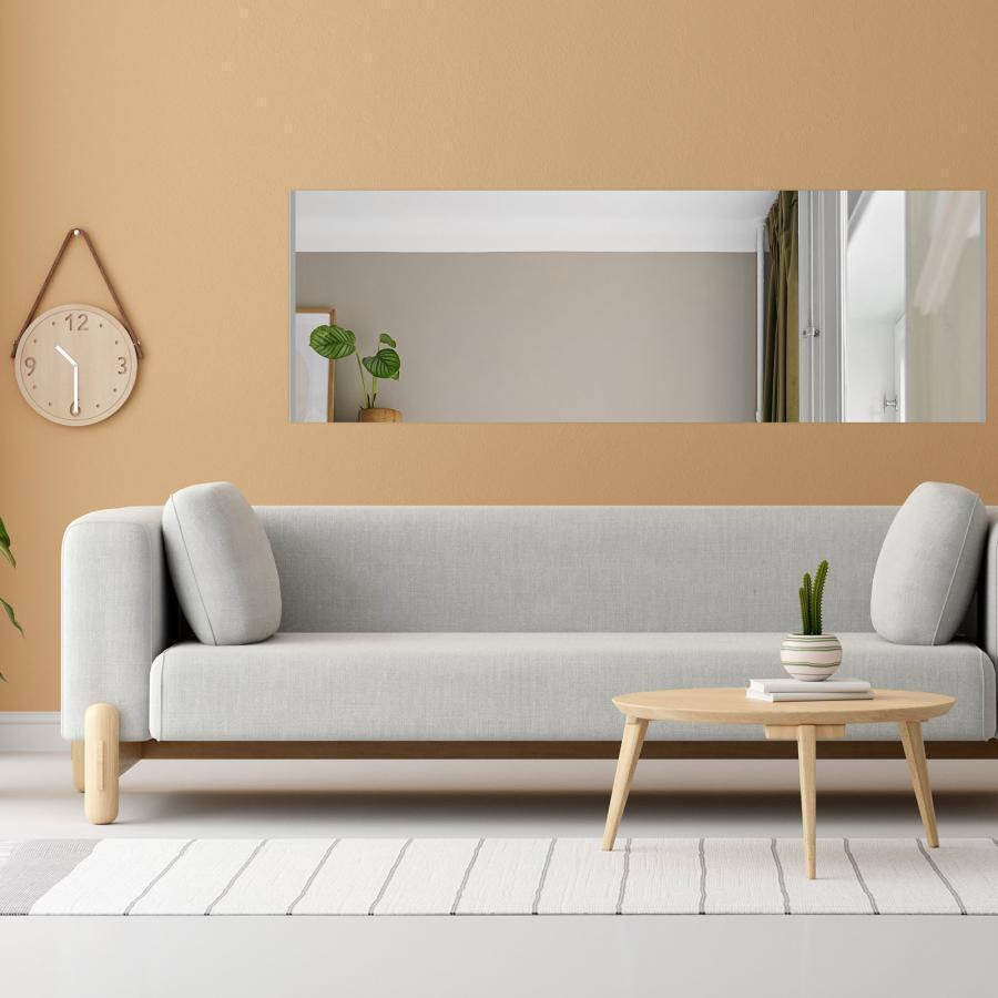 リビングルームの壁に壁かけ鏡の取り付けると、空間が広く感じられる