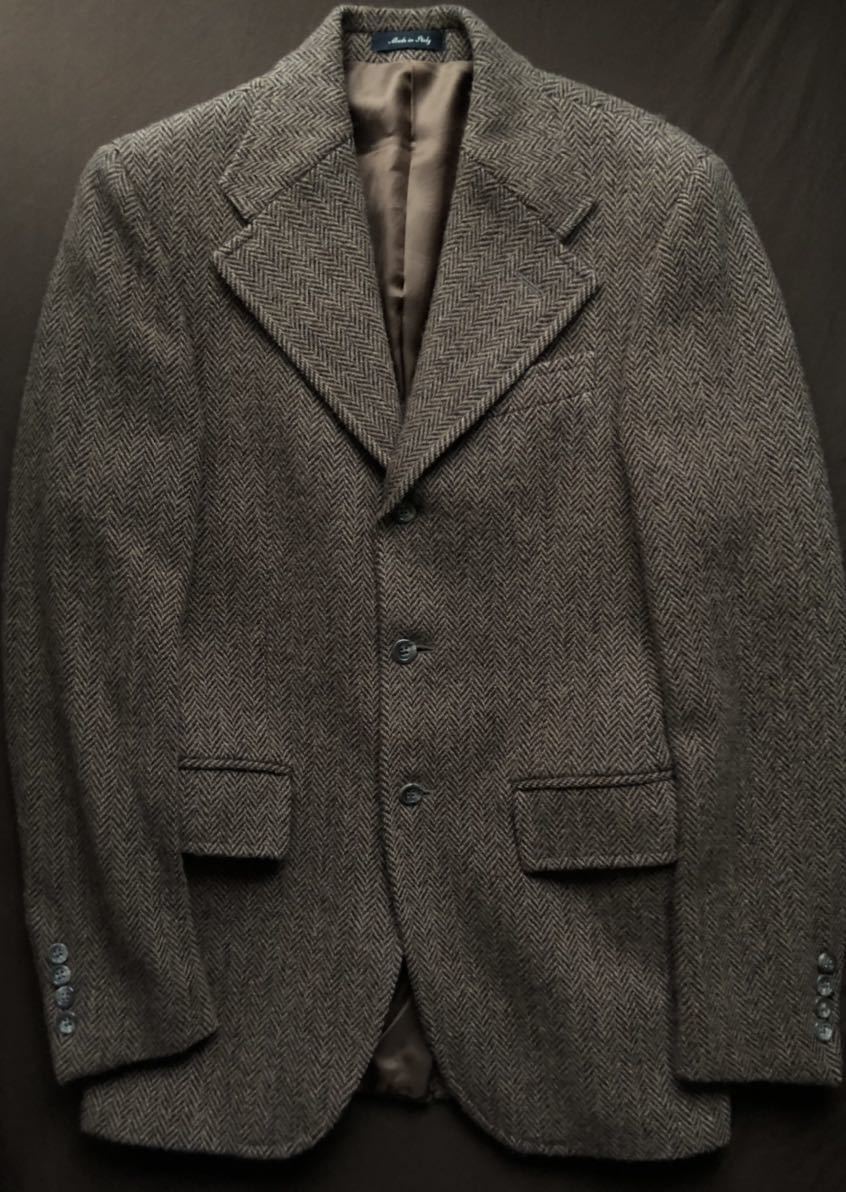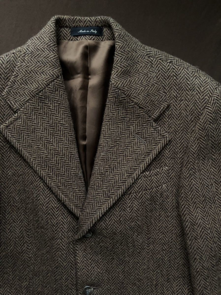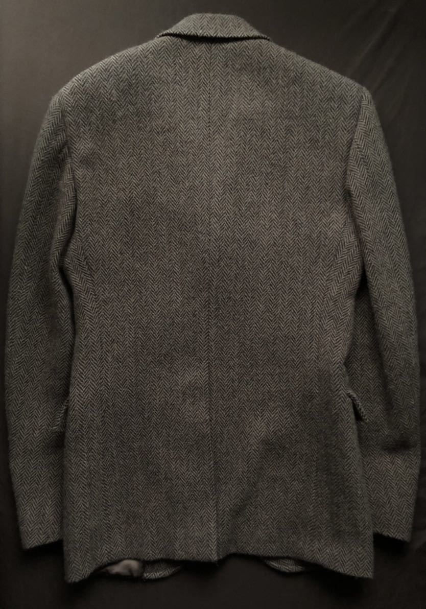 1940年台のスーツをサンプリングしたであろう幅広なラペルとドロップショルダー、三つボタンにバックはセンターベントと当時の時代背景を彷彿とさせる素晴らしい作り込み。