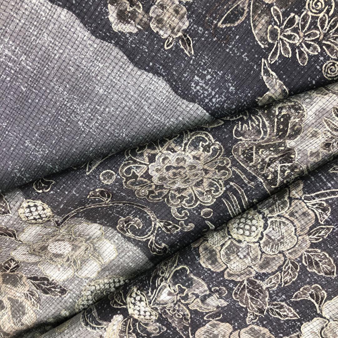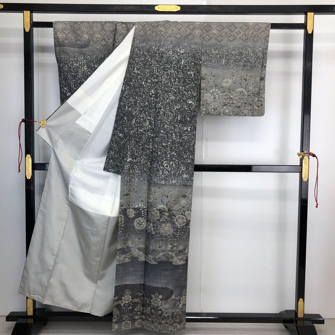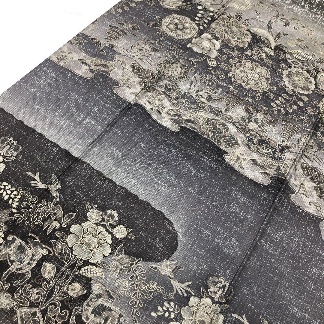 石墨色ベースの落ち着きのあるお色味にモダンで美しい花柄模様がデザインされた素敵な柄裄のお品でございます。