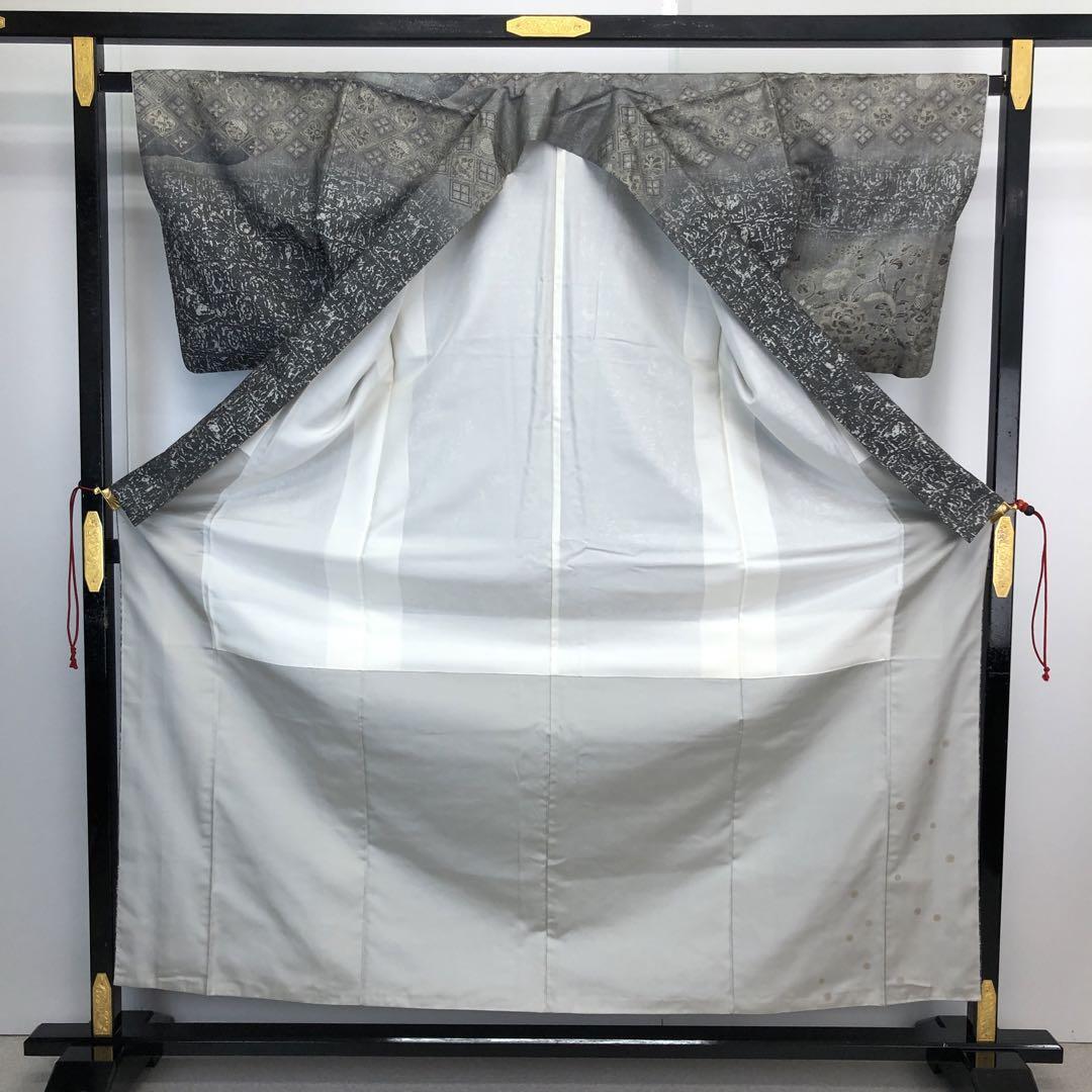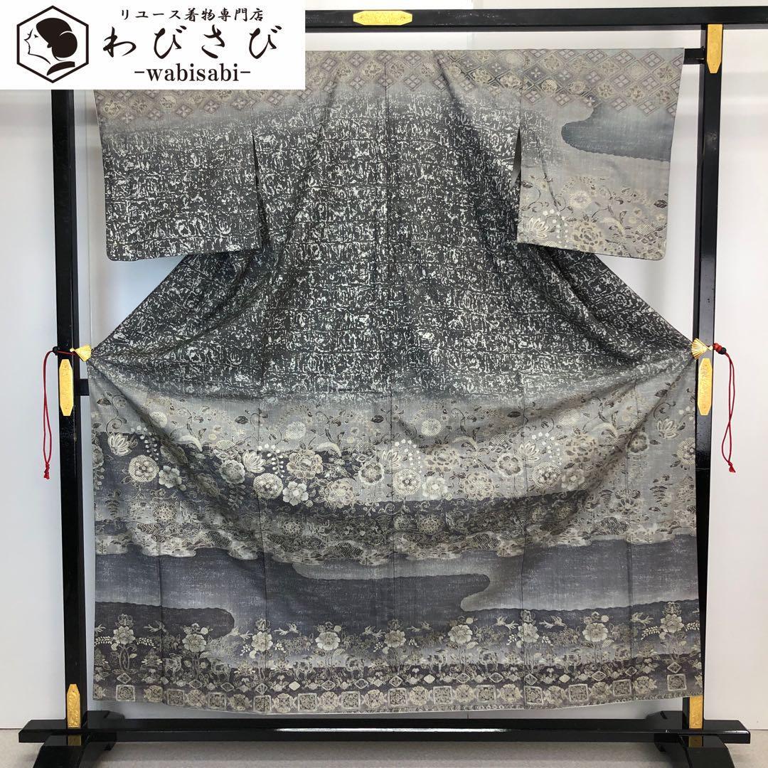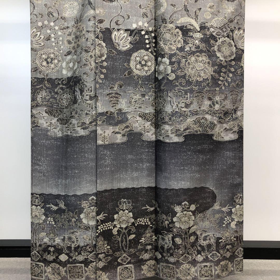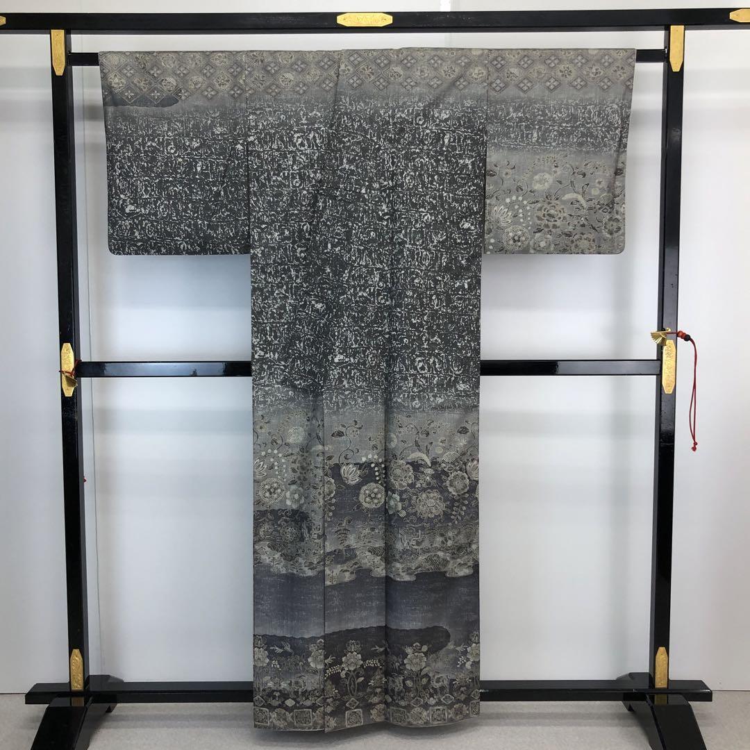 石墨色ベースの落ち着きのあるお色味にモダンで美しい花柄模様がデザインされた素敵な柄裄のお品でございます。