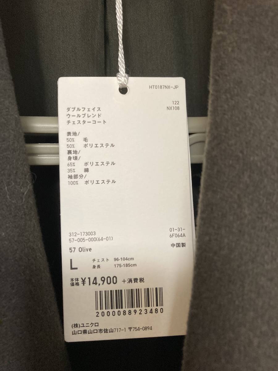 UNIQLO U 旧タグ ダブルフェイスウールブレンドチェスターコード Lサイズ Olive 新品タグ付き(左肩甲骨辺りに薄い傷あり)