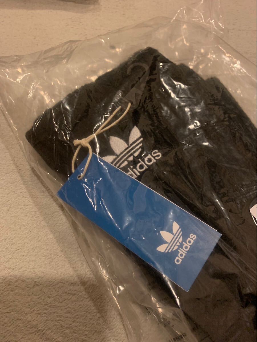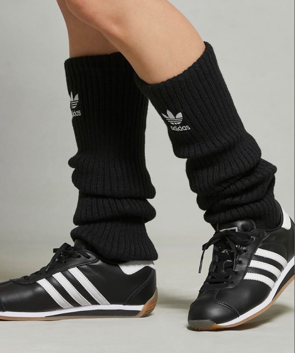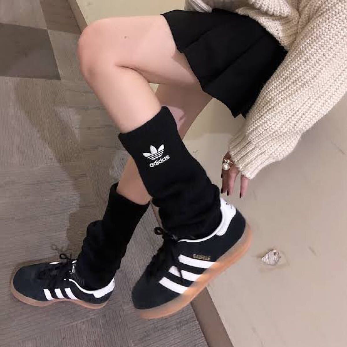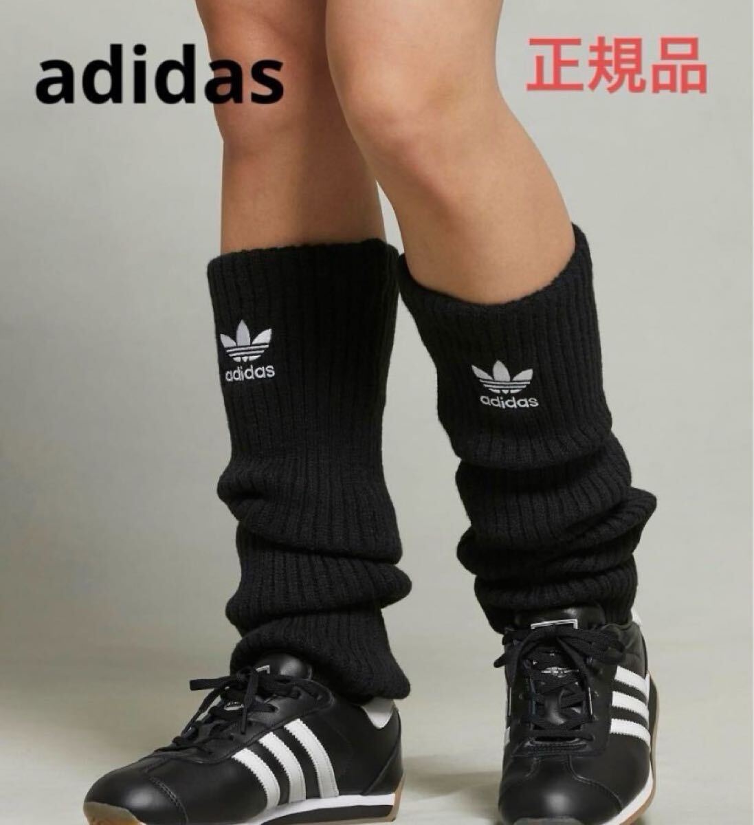 アディダスのロゴが施されたリブ編みのレッグウォーマーは、シンプルながらもスタイリッシュな印象を与えます。