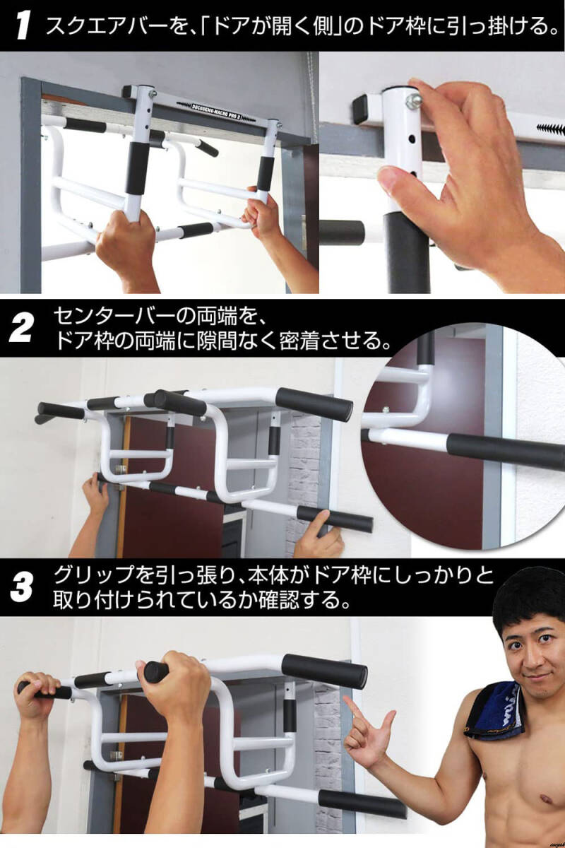 ドアに引っ掛けるだけで簡単に懸垂やぶら下がり運動ができる便利な器具です。