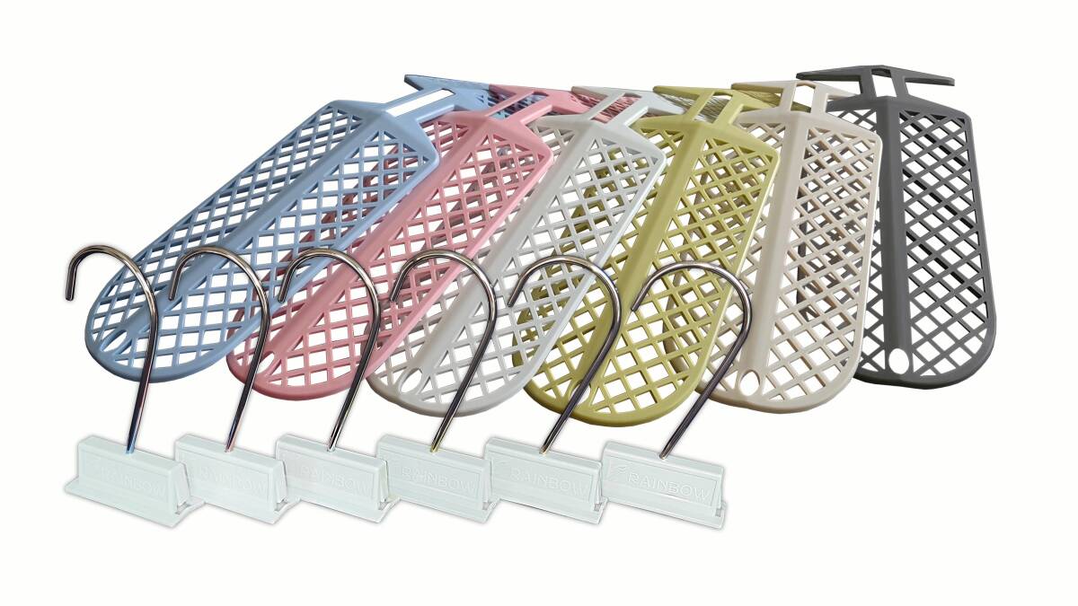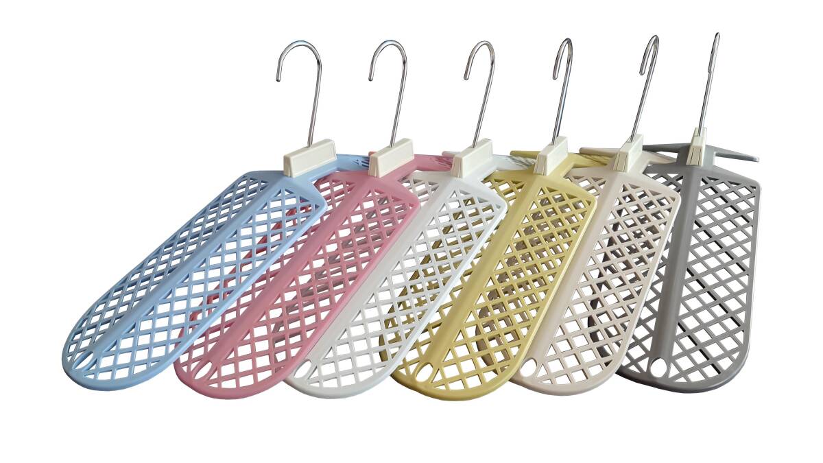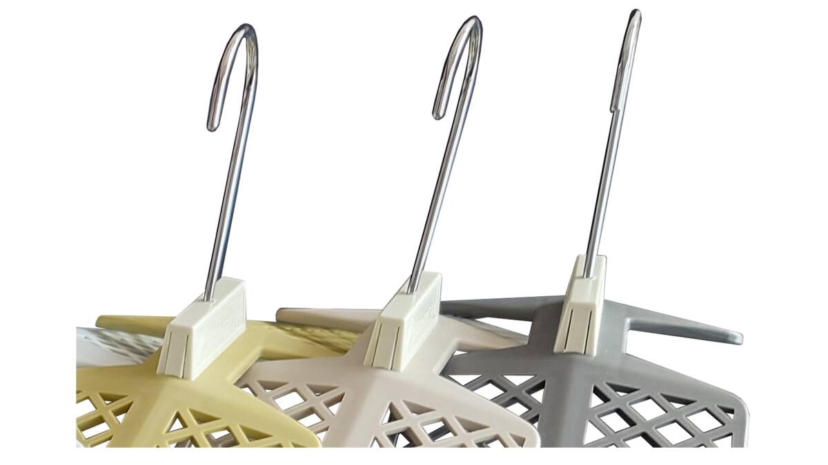 カラットハンガーは人体の肩幅・厚さ・勾配を模した形状とメッシュ構造で大切なセーターなどの型崩れを防ぎ素早く乾燥させることが出来ます。 またインテリアを重視したデザインとカラー・日本の色、清海・桜花・朝霧・若葉・大地・夏夜の6色でお洗濯を楽しんでいただきたい思いが込められたドライハンガーです。
