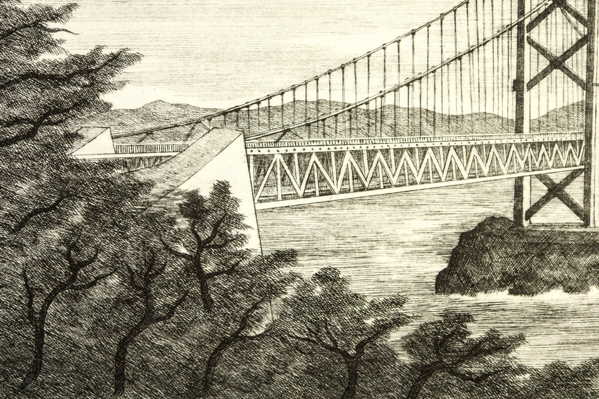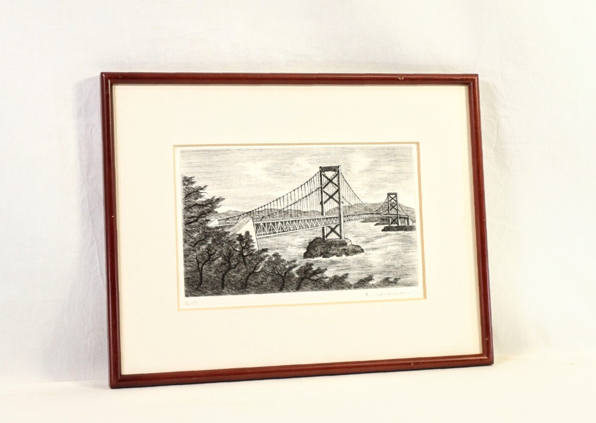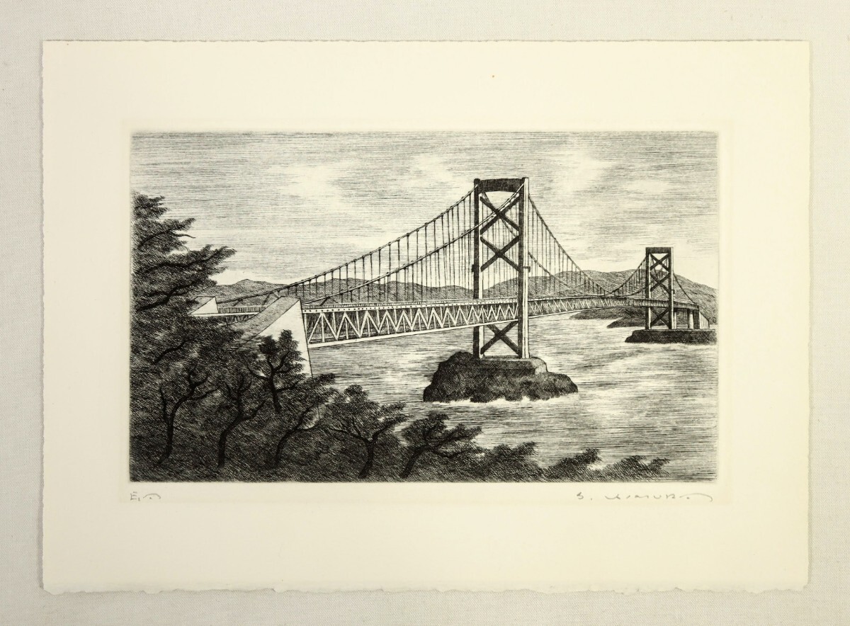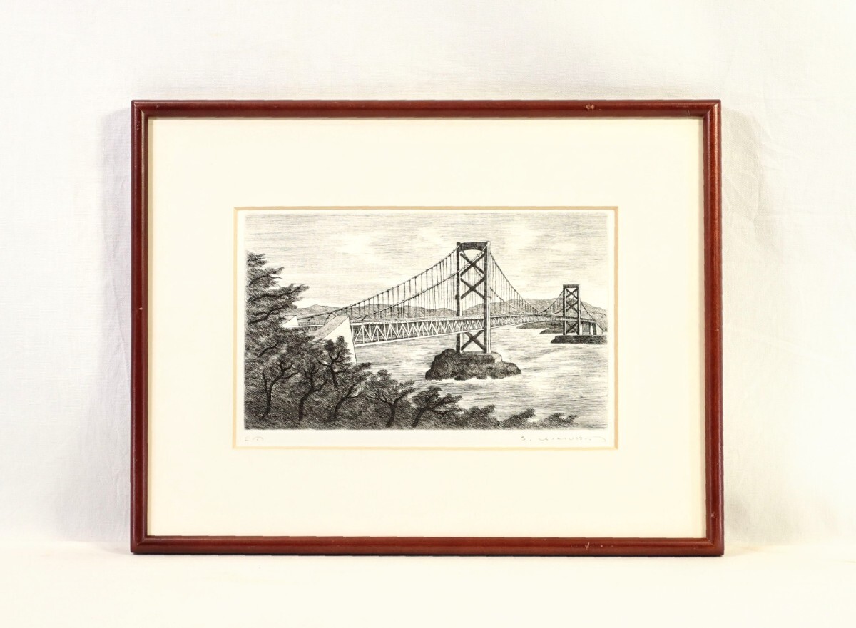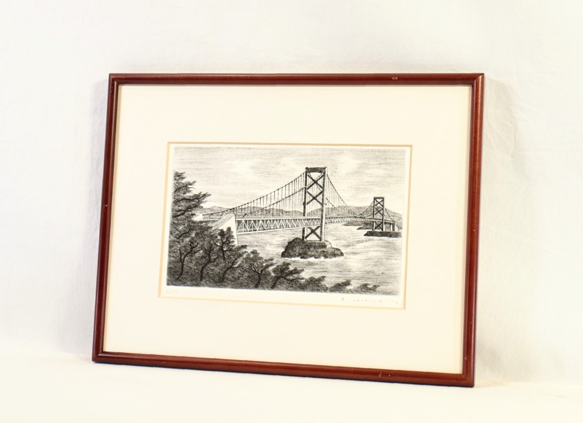 真作 木村茂 1985年銅版画「大鳴門橋」画寸 24×14cm 奈良県出身 第一美術会員 泉茂に師事 繊細な作品は詩情を超え見る者の心に訴える 9929