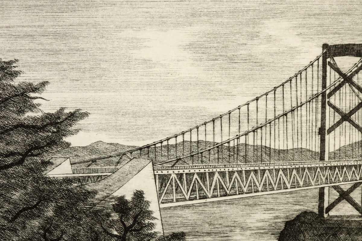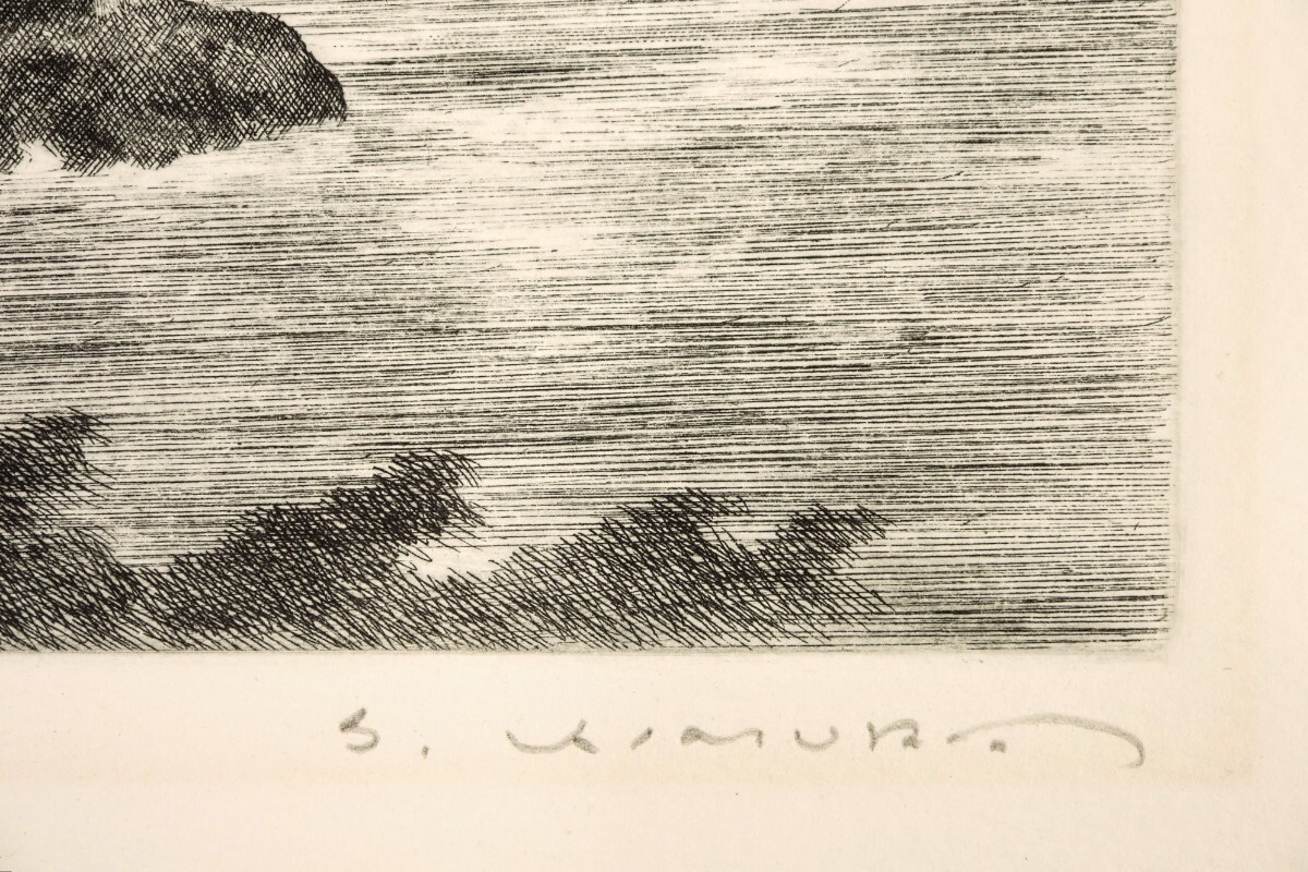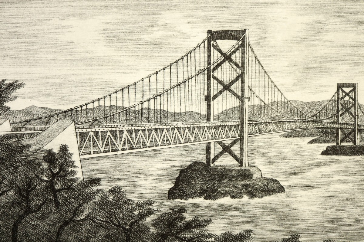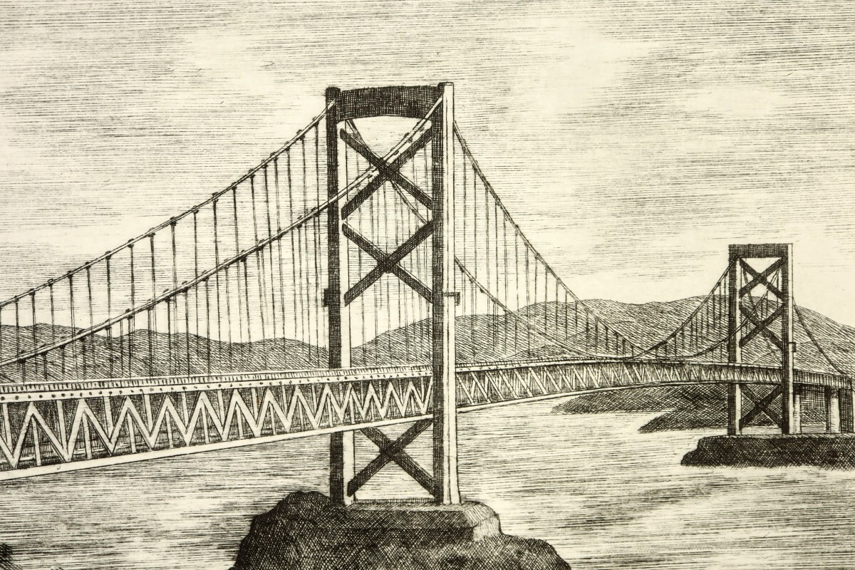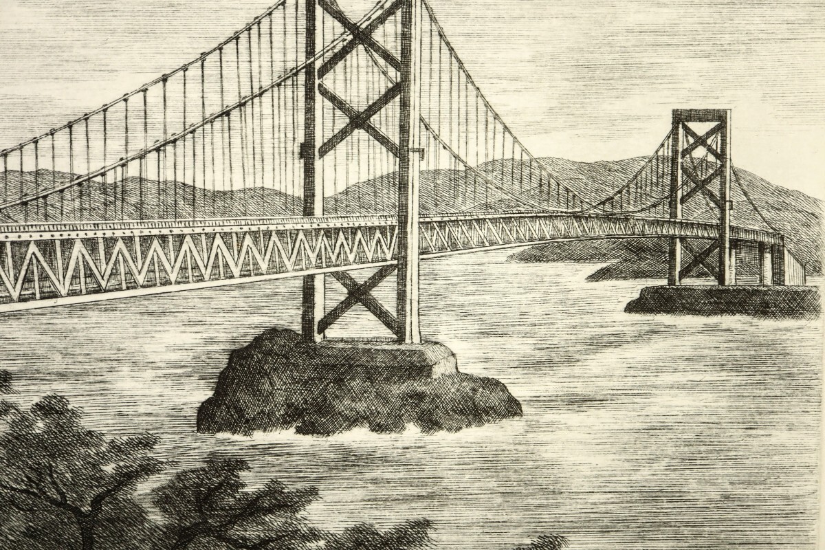 真作 木村茂 1985年銅版画「大鳴門橋」画寸 24×14cm 奈良県出身 第一美術会員 泉茂に師事 繊細な作品は詩情を超え見る者の心に訴える 9929