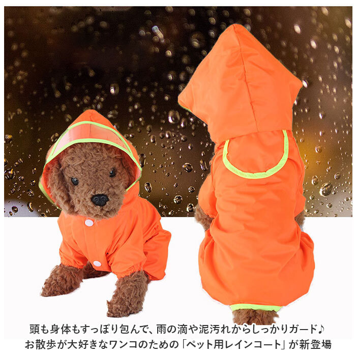 | 商品説明 | ・・頭も身体もすっぽり包んで、雨の滴や泥汚れからしっかりガード♪お散歩が大好きなワンコのための「ペット用レインコート」が新登場。 ・【お出掛け前に簡単装着】 ・コートをワンちゃんの背中にサッと掛けたら、後足・前足の順に袖に通し、前合わせのスナップボタンを閉じるだけで装着が簡単! ・【水滴を弾くはっ水生地】 ・コートの生地には水滴を玉のように弾くPVCコーティング加工を施してあるため、冷たい雨もお腹の泥汚れも気にせずに快適なお散歩タイム♪ ・【柔らか透明フード付き】 ・柔らか透明フードがお散歩中の視線を妨げず、冷たい雨や強い風からワンちゃんの頭をガード! ・【袖口ゴムで快適さをキープ】 ・袖口のゴムギャザーが足首にぴったりフィットして、お散歩中の泥はねや雨の侵入をブロック! ・【おトイレ楽ちん・ゆったり設計】 ・ワンちゃんがおトイレする時にもたつかない♪お腹周りが大きく開いたゆったりデザイン。 ・【フラップ付きリードホール】 ・首の付け根のリード用ホールを使用すれば、首輪のDカンとリードをスムーズに接続可能。雨が背中に吹き込まないフラップ付き。 ・【ピッタリサイズをチョイス】 ・XSサイズ~2XLサイズまでの6サイズ展開で、小型犬から中型犬まで幅広くカバー。(※体重2~3kg程度の小型犬から、12kg程度の中型のワンちゃんに適したサイズです。) ・【雨の日もカラフルに♪】 ・雨の日も楽しくお出掛けできるベーシック&ネオンカラーの色鮮やかなバリエーション。男の子も女の子もお気に入りのカラーがきっと見つかる♪ |