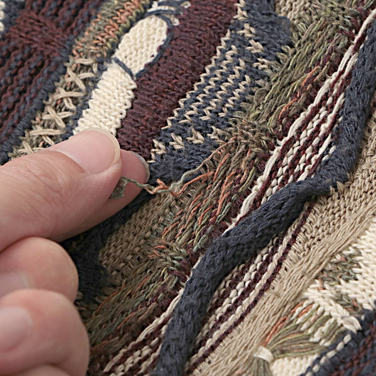 ワインレッド、ネイビー、ベージュなどの落ち着いたカラーを使った3Dニット。