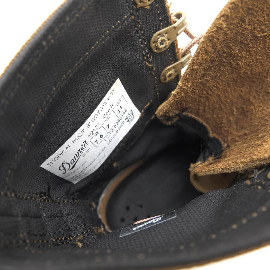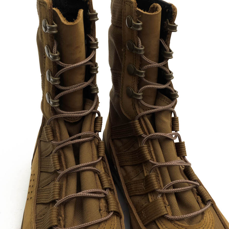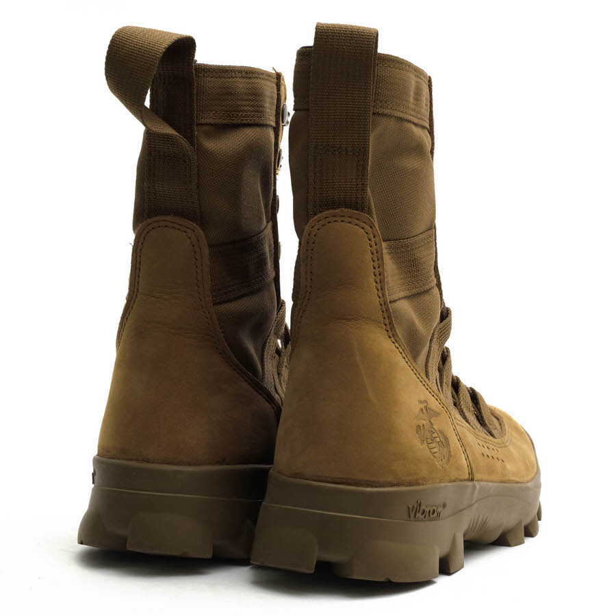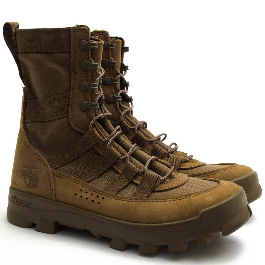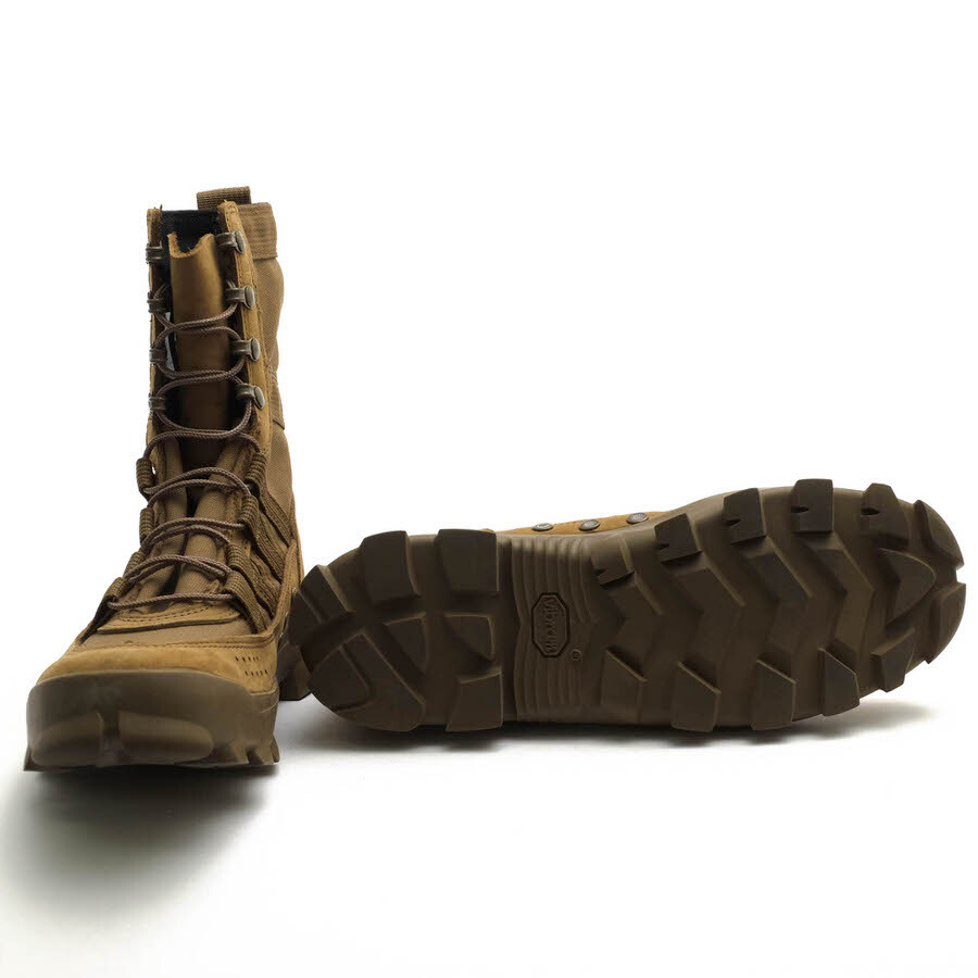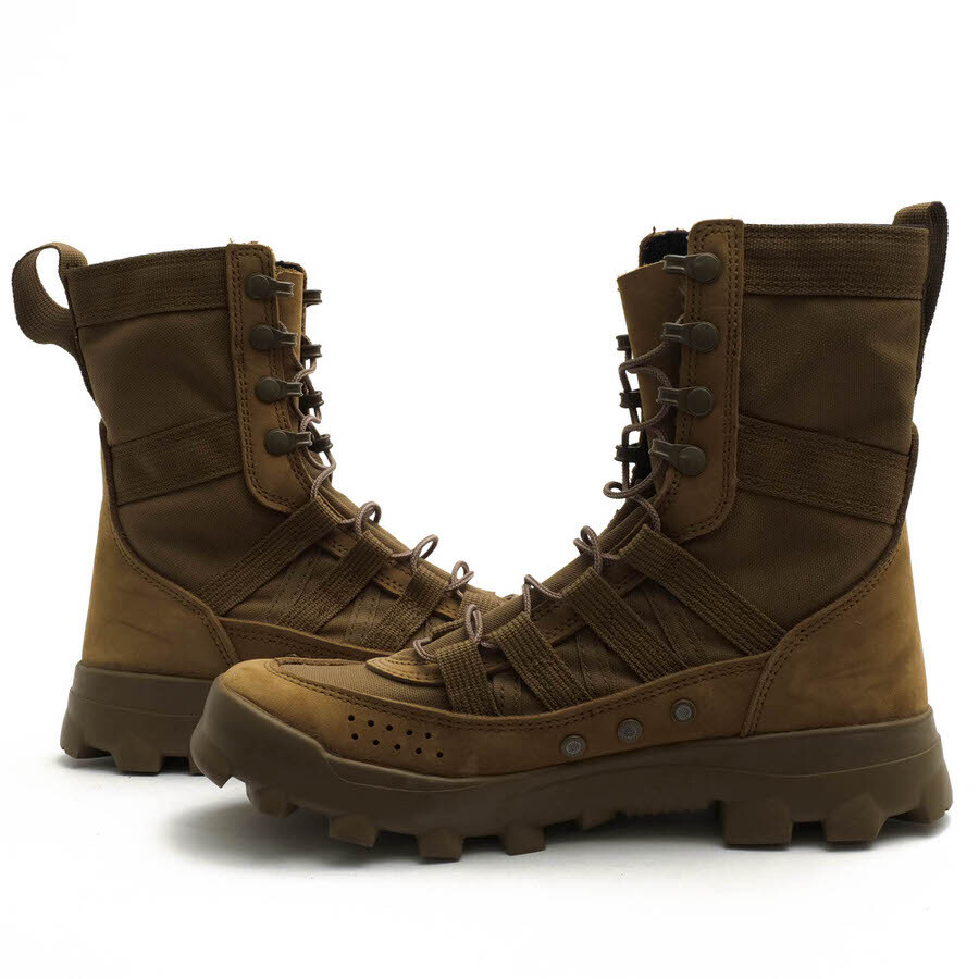 | 米国海軍マークの刻印が施され海兵隊のオプショナルウェアとして認可された「52121 Tropical EGA 8 Coyote Hot」。高温多湿の環境や水浸しの戦場に対応するために設計されています。アッパーには耐摩耗性に優れたヌバックレザーとナイロンを使用。アウトソールには全方向ラグを備えたビブラムパナマアウトソールが使用されており、過酷な環境でも最高の可動域を約束します。内部には、通気性と吸湿発散性に優れたエアメッシュライニングが装備されており、排水と通気を計算したポリウレタンフットベッドも備えています。連邦取引委員会の最も厳しいガイドラインを満たすベリー準拠の認証を受けており、アメリカ国内で調達された原材料から製造されたすべてのコンポーネントがアメリカ製であることを保証したモデルです。 |