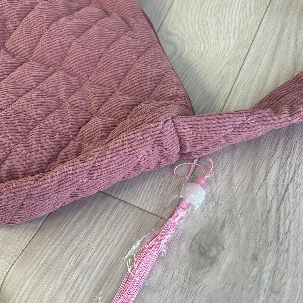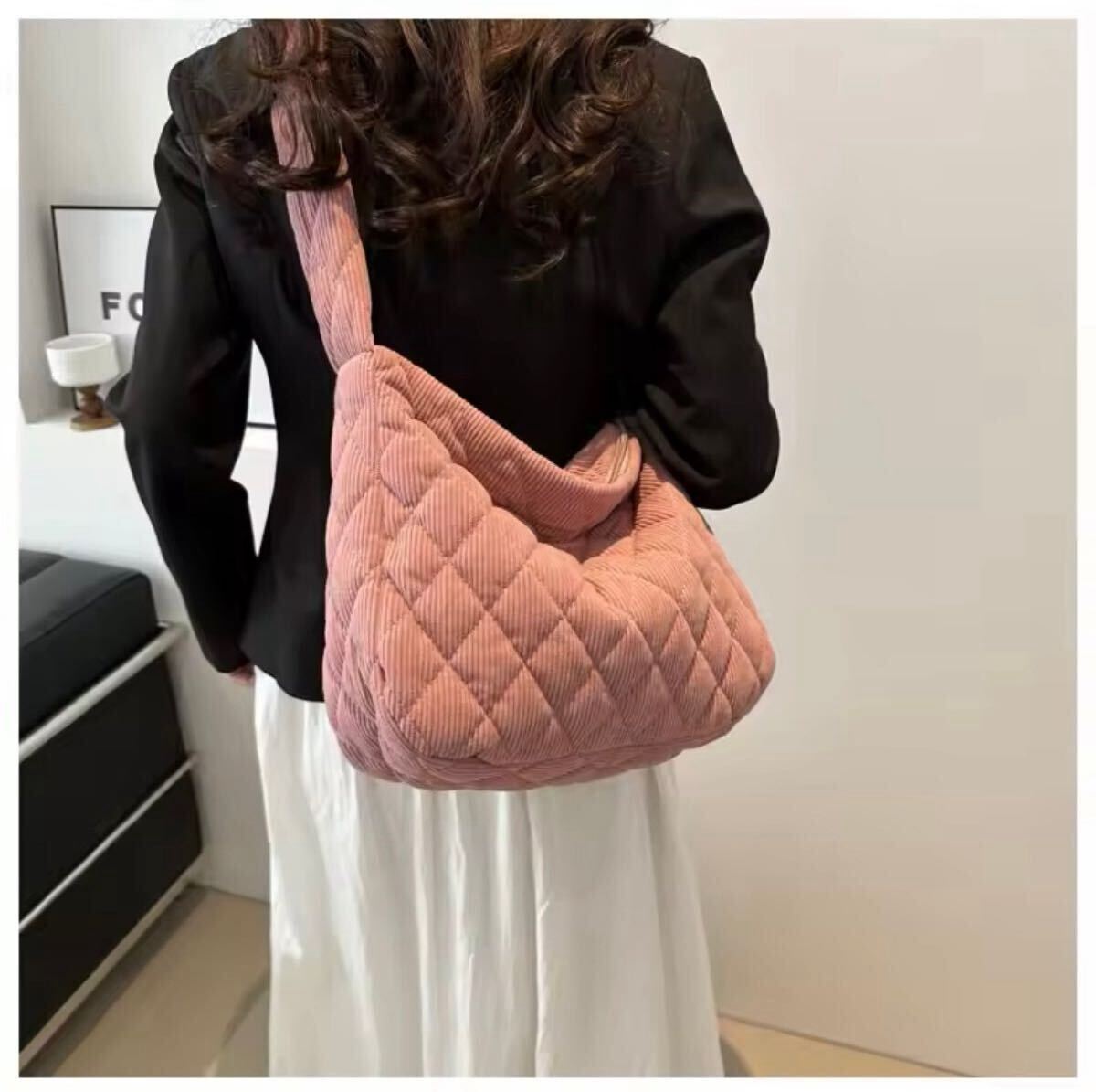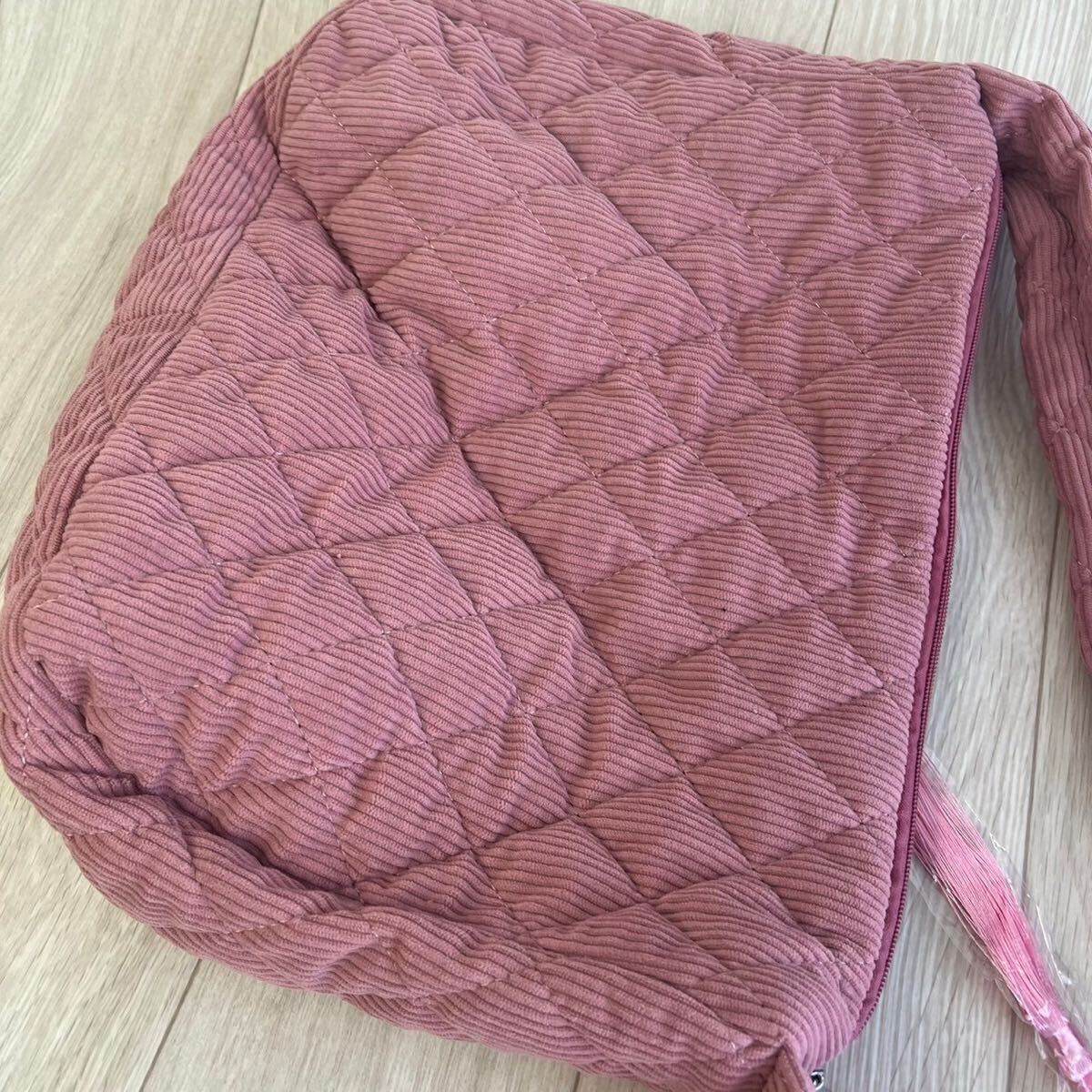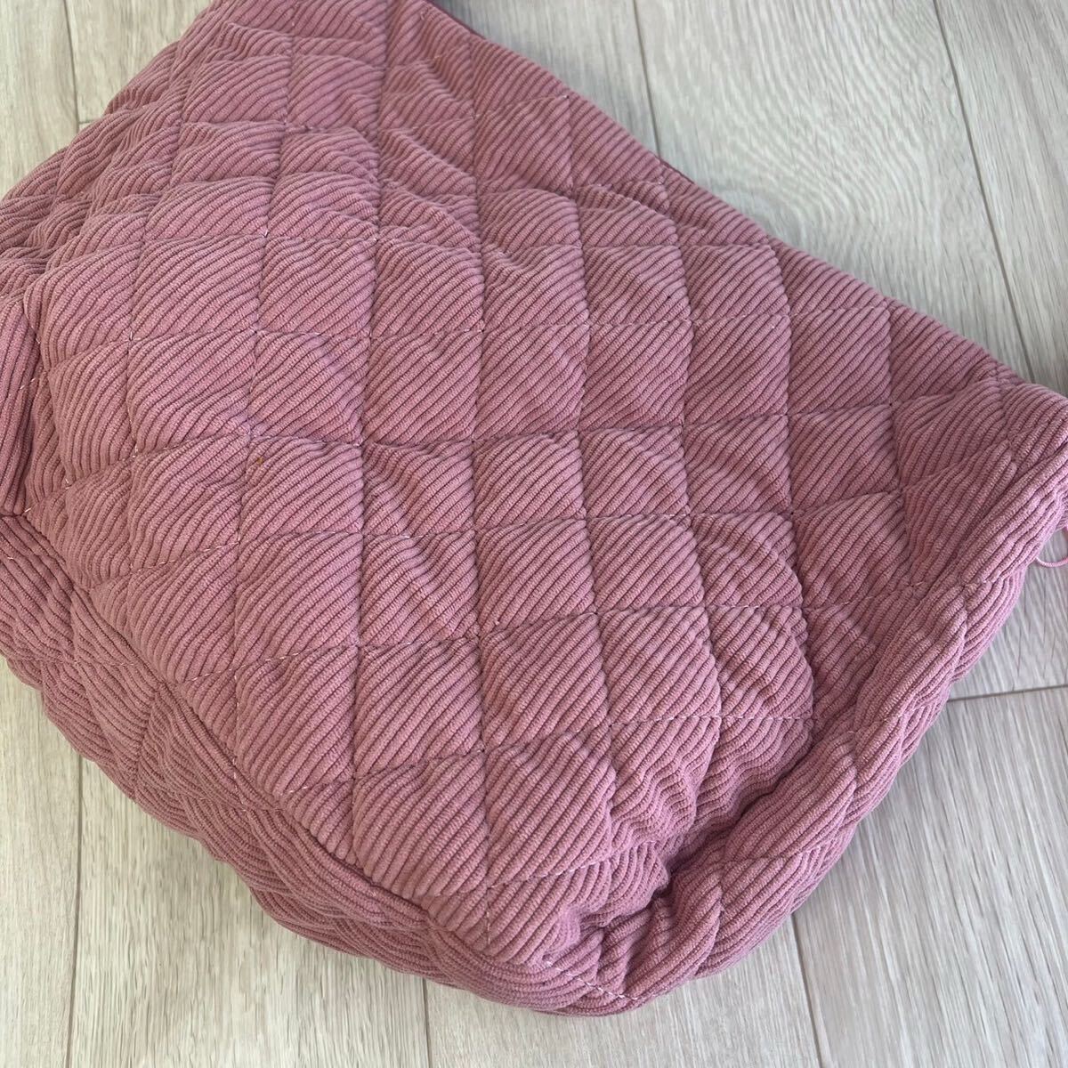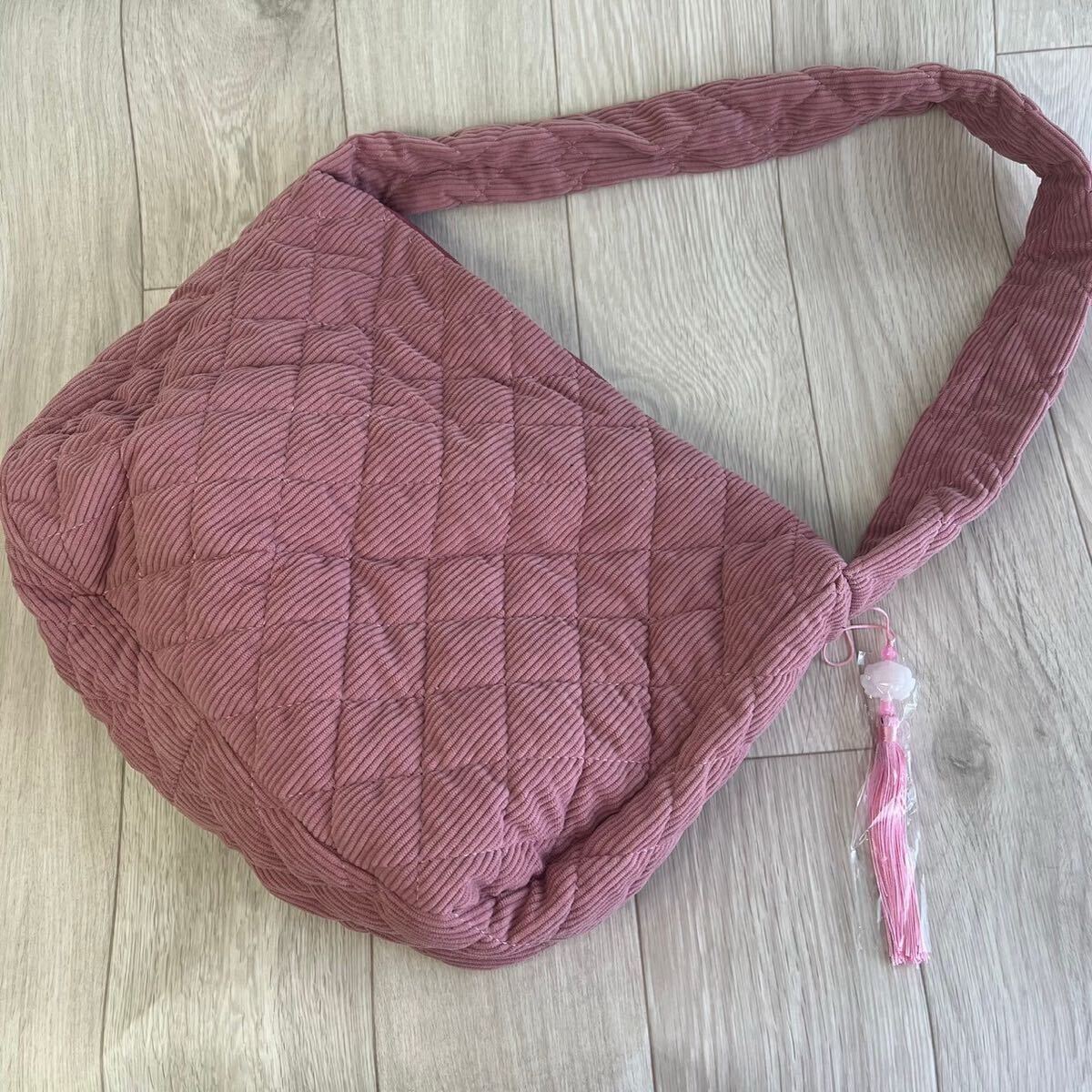 このショルダーバッグは、キルティングデザインが特徴で、シンプルながらも洗練された印象を与えます。コーデュロイ素材を使用しており、柔らかい手触りが魅力です。