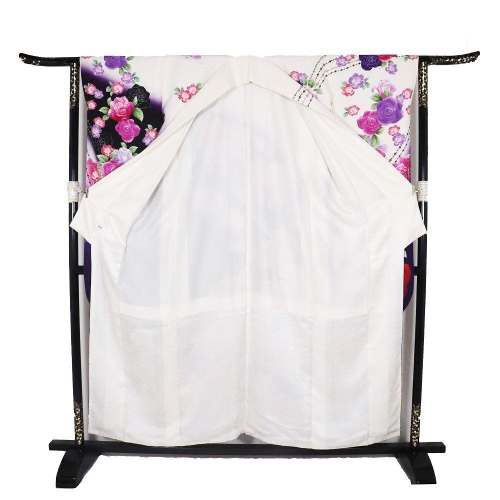 | 振袖 袷 丹後縮緬地 薄いクリーム色・黒・紫・暈し・金糸通し地 十字架ペンダントトップ・チェーン・薔薇・蝶 スパンコール入り 163 広襟 | |